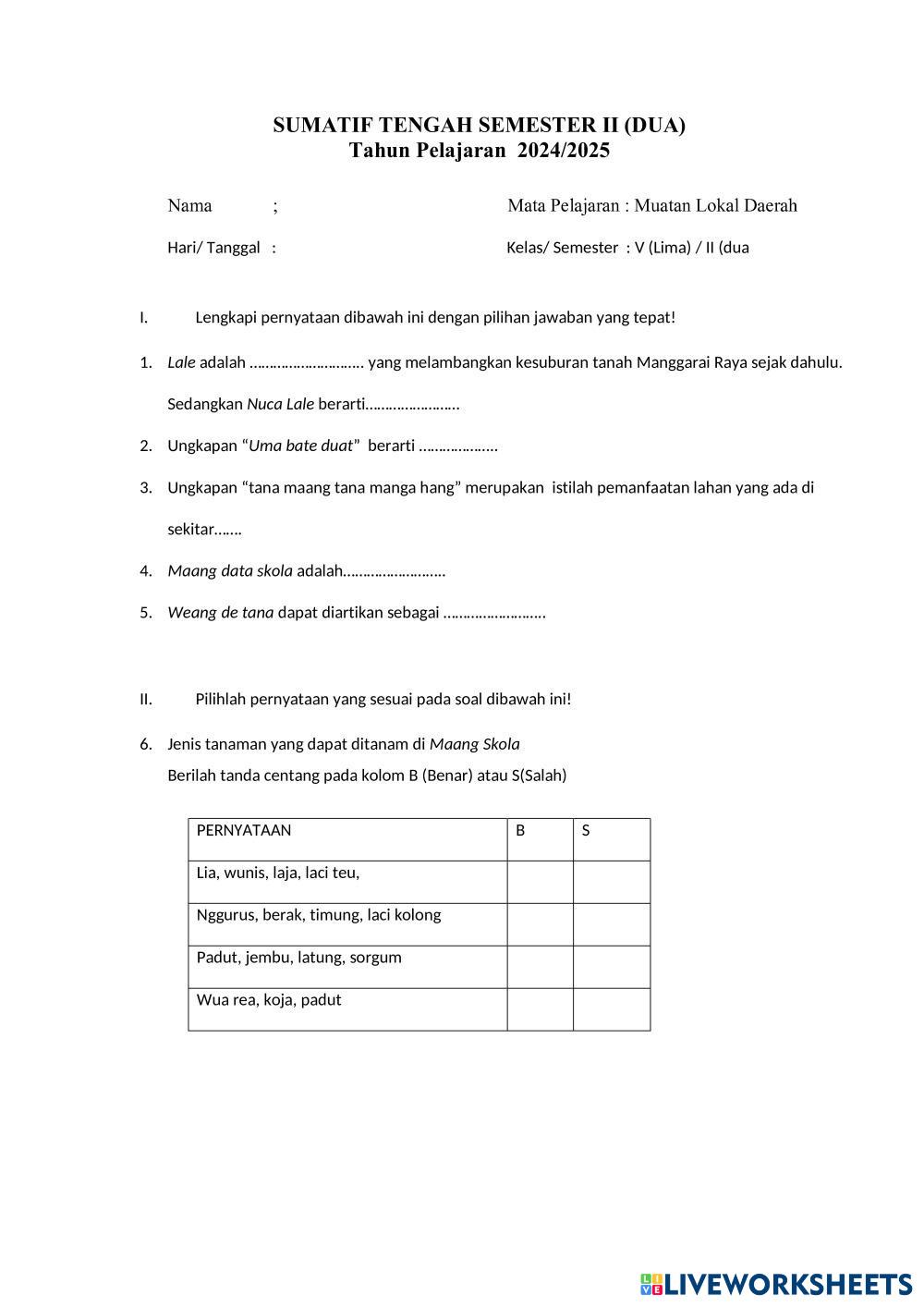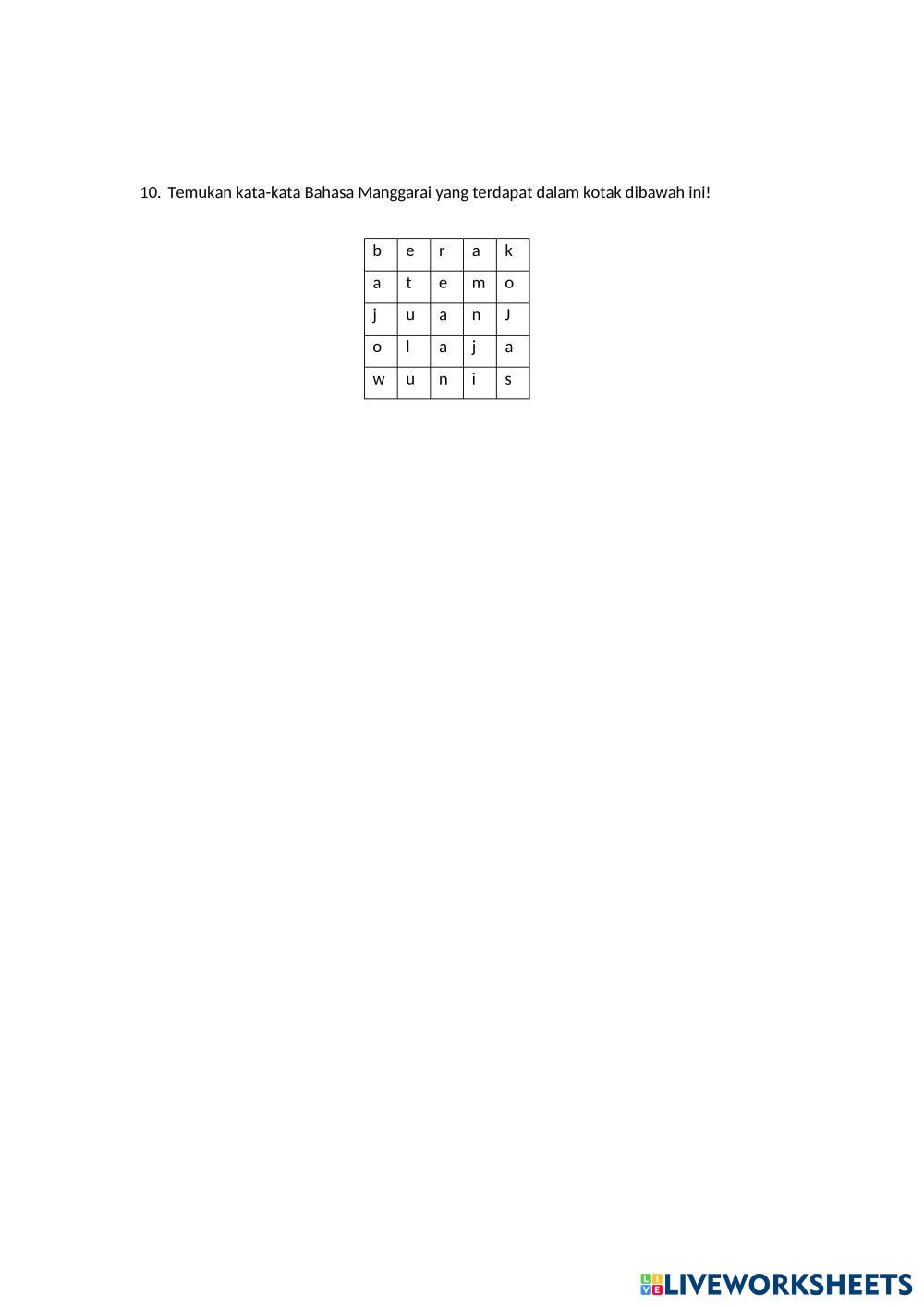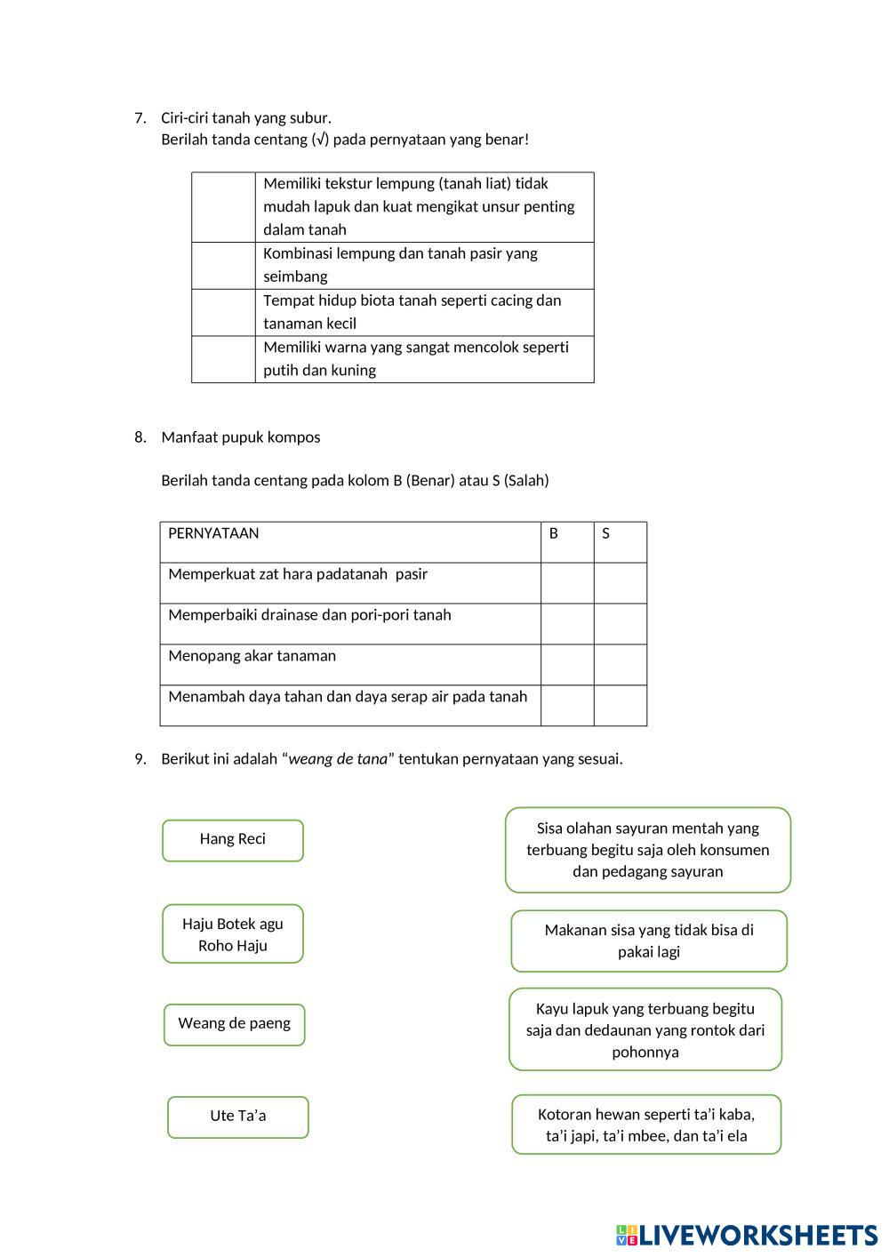 Created byMeltildis Eprisa Muatan Lokal Bahasa Daerah Age 10-14 level: 5 Indonesian Author's Instructions My Google Classroom Courses × 0 classes selected (0 students total) Quick Access Select all classes (0 classes) All Classes Loading courses... Cancel Share Share to selected Course __COURSE_NAME__ __STUDENT_NAME__ (__STUDENT_EMAIL__) SUMATIF TENGAH SEMESTER II Download Worksheet Validation Check my answers Emails my answers to my teacher Full name Group/level School subject Teacher's email or key code Close Submit Validating worksheet... (12) Your answers have been sent to your teacher. Good luck! OK We encountered an error submitting your answers. Please try again. OK Advertisement | Go Ad Free Created byMeltildis Eprisa Muatan Lokal Bahasa Daerah Age 10-14 level: 5 Indonesian Author's Instructions