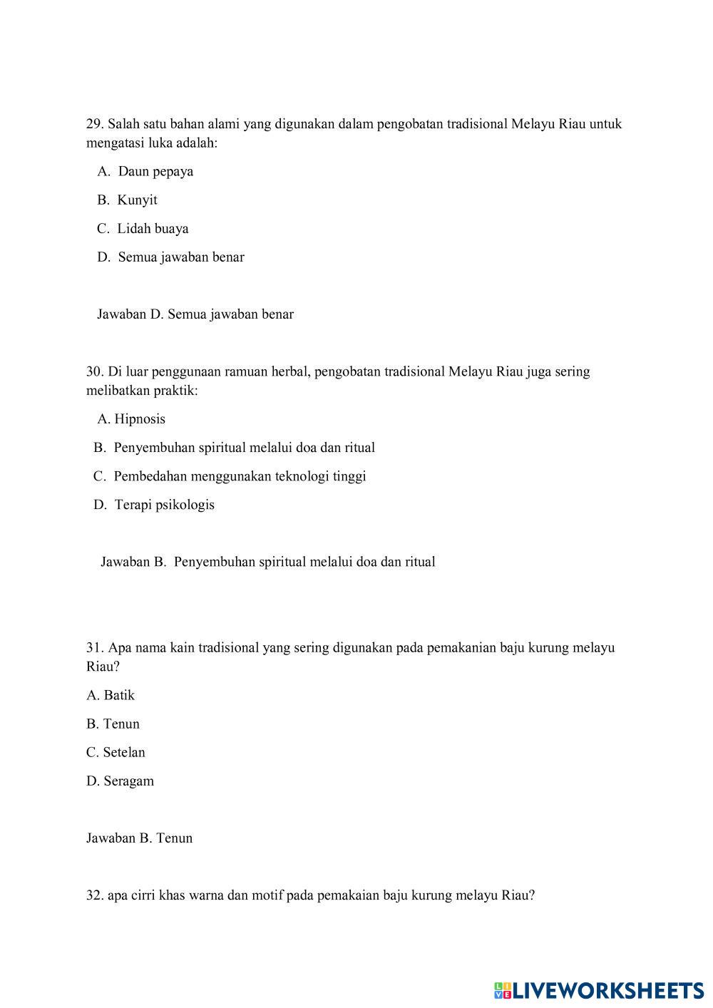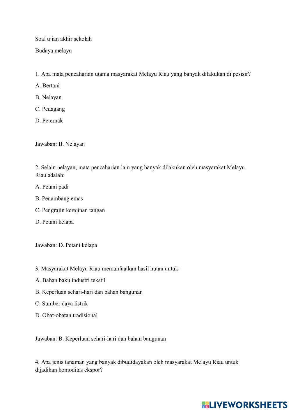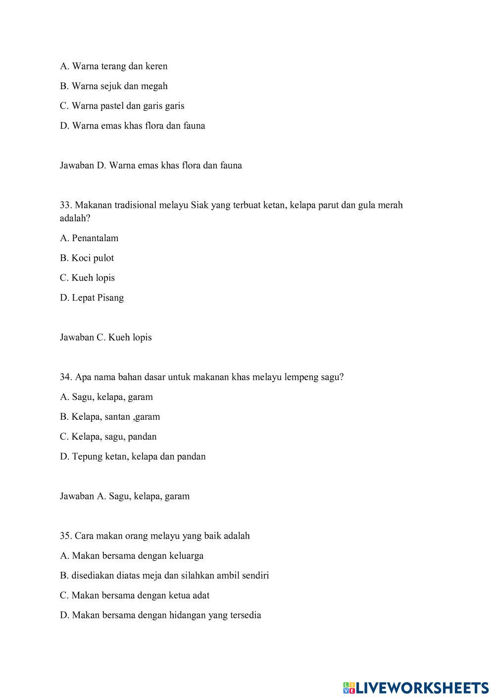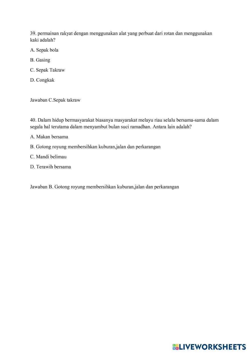 Created byJumi Tuti Handayani Muatan Lokal Budaya Melayu Riau Age 15+ level: FASE LANJUTAN Indonesian Author's Instructions My Google Classroom Courses × 0 classes selected (0 students total) Quick Access Select all classes (0 classes) All Classes Loading courses... Cancel Share Share to selected Course __COURSE_NAME__ __STUDENT_NAME__ (__STUDENT_EMAIL__) UJIAN UAS NGAH Download Worksheet Validation Check my answers Emails my answers to my teacher Full name Group/level School subject Teacher's email or key code Close Submit Validating worksheet... (12) Your answers have been sent to your teacher. Good luck! OK We encountered an error submitting your answers. Please try again. OK Advertisement | Go Ad Free Created byJumi Tuti Handayani Muatan Lokal Budaya Melayu Riau Age 15+ level: FASE LANJUTAN Indonesian Author's Instructions