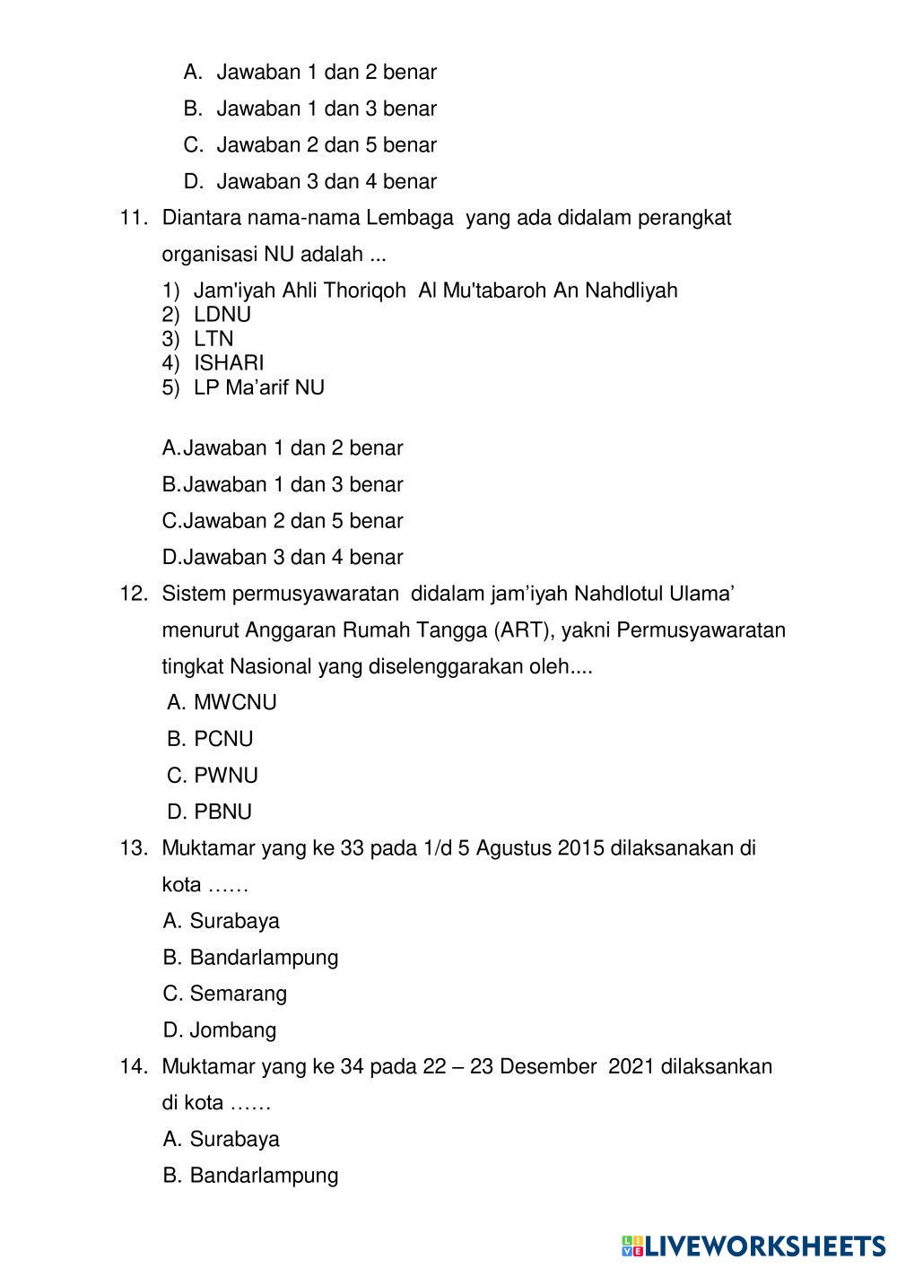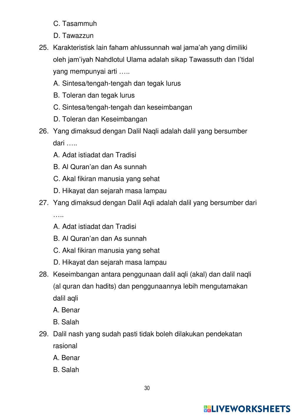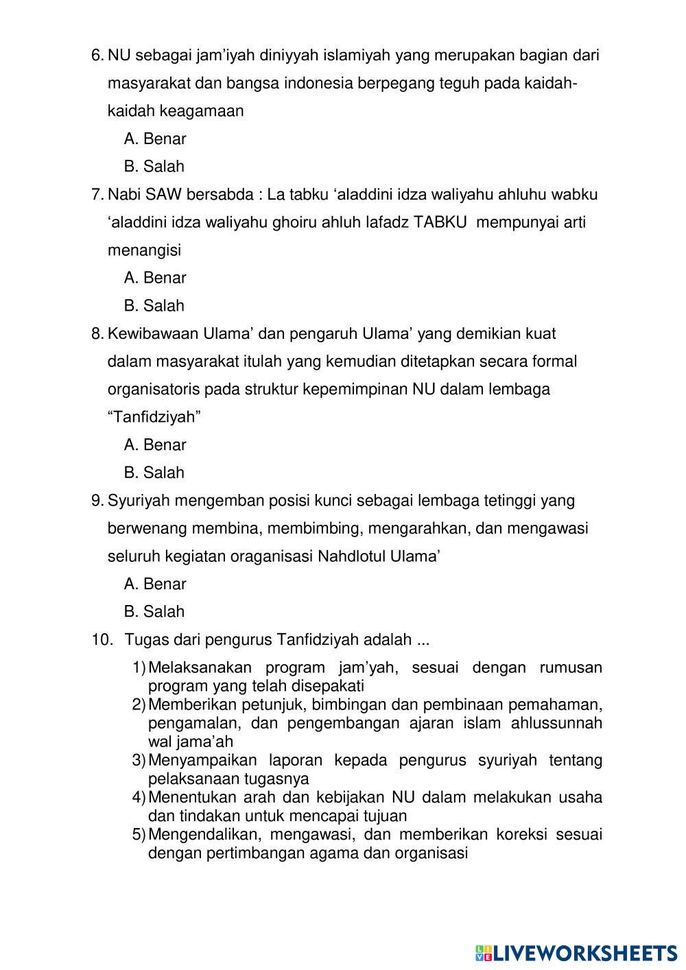 Created byM. NASRULLOH, S.Ag MULOK ASWAJA AMALIYAH NU Age 12+ level: 7 Indonesian Author's Instructions My Google Classroom Courses × 0 classes selected (0 students total) Quick Access Select all classes (0 classes) All Classes Loading courses... Cancel Share Share to selected Course __COURSE_NAME__ __STUDENT_NAME__ (__STUDENT_EMAIL__) SAT MULOK ASWAJA 2024 Download Worksheet Validation Check my answers Emails my answers to my teacher Full name Group/level School subject Teacher's email or key code Close Submit Validating worksheet... (12) Your answers have been sent to your teacher. Good luck! OK We encountered an error submitting your answers. Please try again. OK Advertisement | Go Ad Free Created byM. NASRULLOH, S.Ag MULOK ASWAJA AMALIYAH NU Age 12+ level: 7 Indonesian Author's Instructions