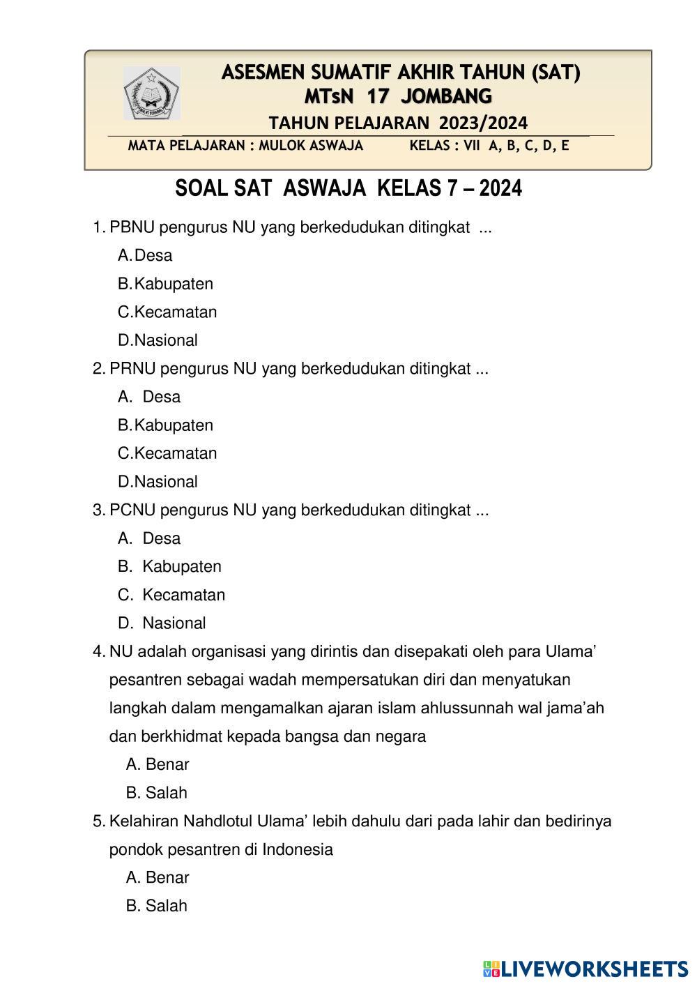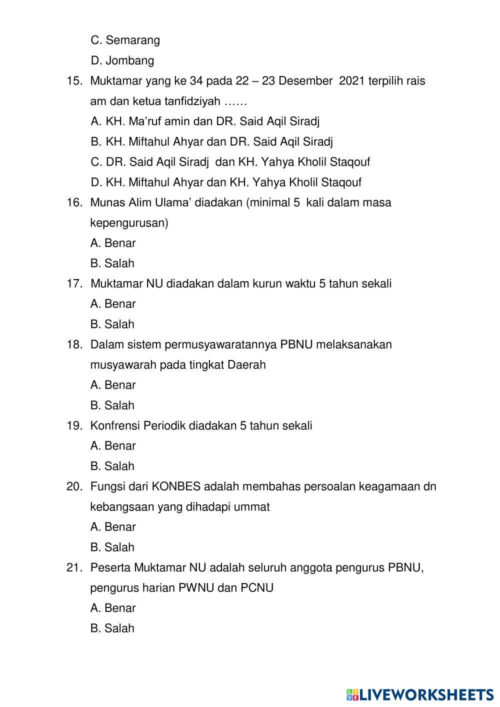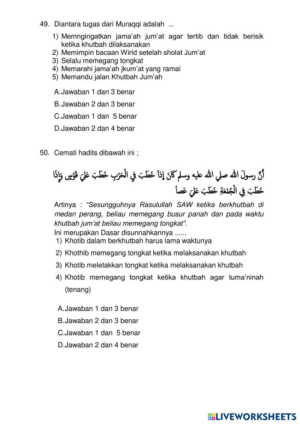 Created byM. NASRULLOH, S.Ag MULOK ASWAJA AMALIYAH NU Age 12+ level: 7 Indonesian Author's Instructions My Google Classroom Courses × 0 classes selected (0 students total) Quick Access Select all classes (0 classes) All Classes Loading courses... Cancel Share Share to selected Course __COURSE_NAME__ __STUDENT_NAME__ (__STUDENT_EMAIL__) SAT MULOK ASWAJA 2024 Download Worksheet Validation Check my answers Emails my answers to my teacher Full name Group/level School subject Teacher's email or key code Close Submit Validating worksheet... (12) Your answers have been sent to your teacher. Good luck! OK We encountered an error submitting your answers. Please try again. OK Advertisement | Go Ad Free Created byM. NASRULLOH, S.Ag MULOK ASWAJA AMALIYAH NU Age 12+ level: 7 Indonesian Author's Instructions