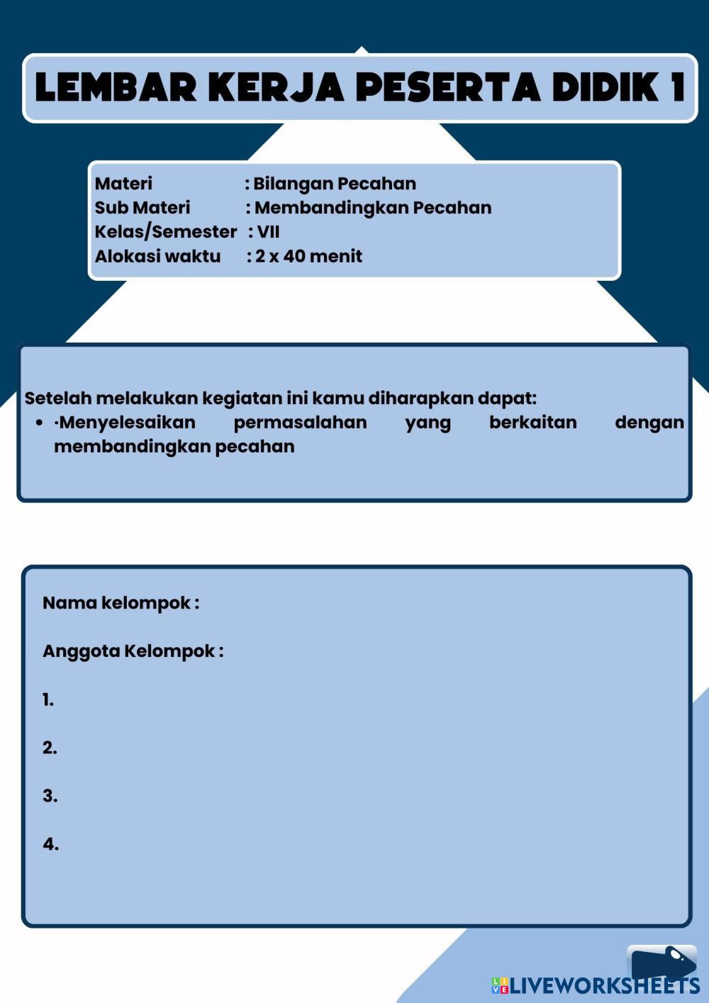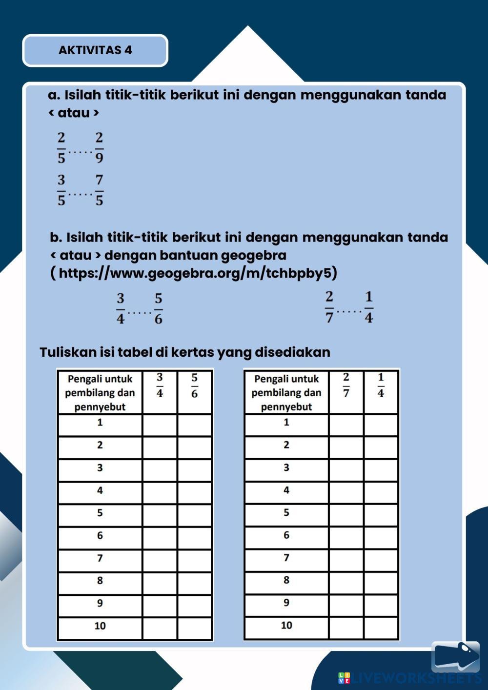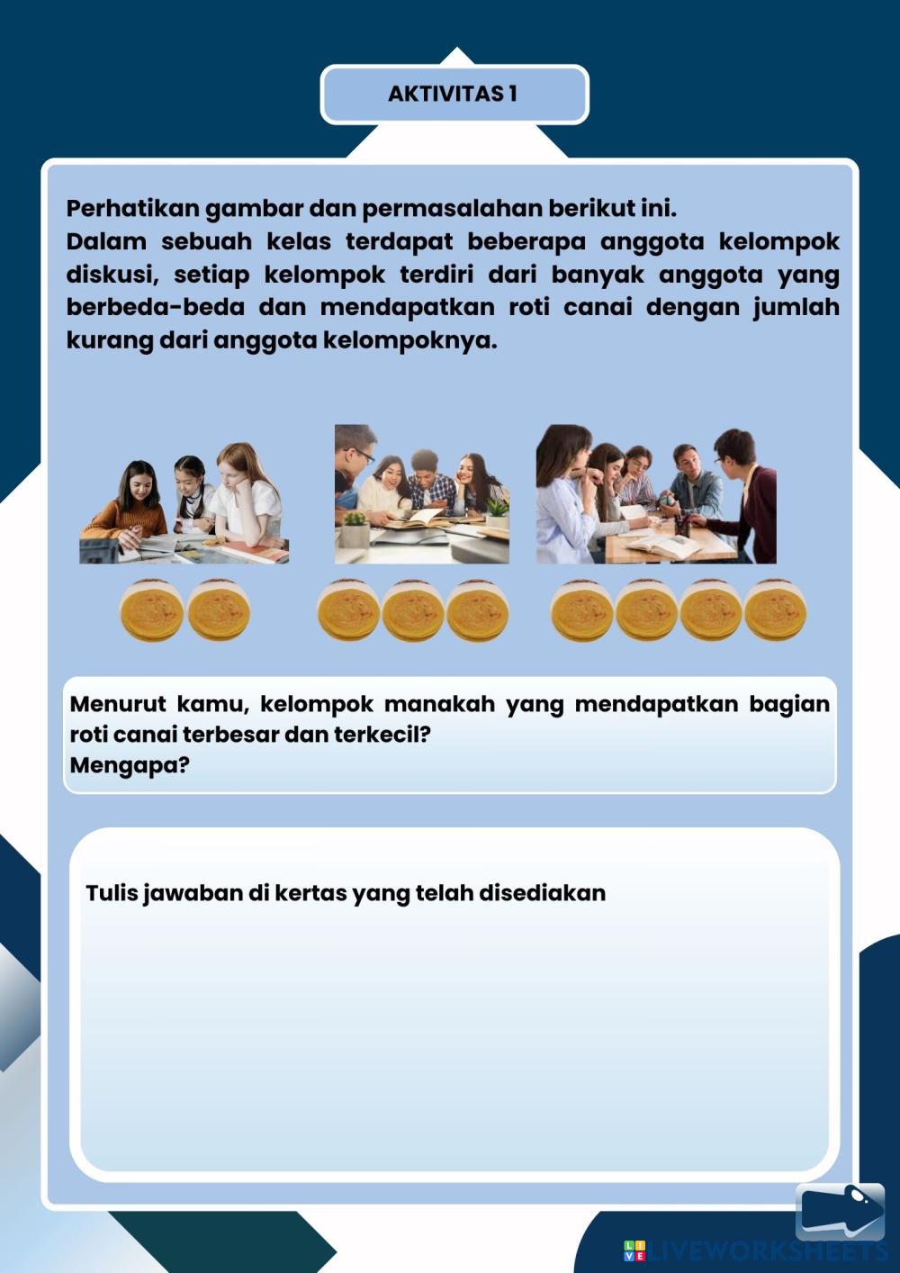 Created byRahmah Johar pecahan Matematika Age 12-18 level: 1 Indonesian Author's Instructions My Google Classroom Courses × 0 classes selected (0 students total) Quick Access Select all classes (0 classes) All Classes Loading courses... Cancel Share Share to selected Course __COURSE_NAME__ __STUDENT_NAME__ (__STUDENT_EMAIL__) Liveworksheet Membandingkan Pecahan Download Worksheet Validation Check my answers Emails my answers to my teacher Full name Group/level School subject Teacher's email or key code Close Submit Validating worksheet... (12) Your answers have been sent to your teacher. Good luck! OK We encountered an error submitting your answers. Please try again. OK Advertisement | Go Ad Free Created byRahmah Johar pecahan Matematika Age 12-18 level: 1 Indonesian Author's Instructions