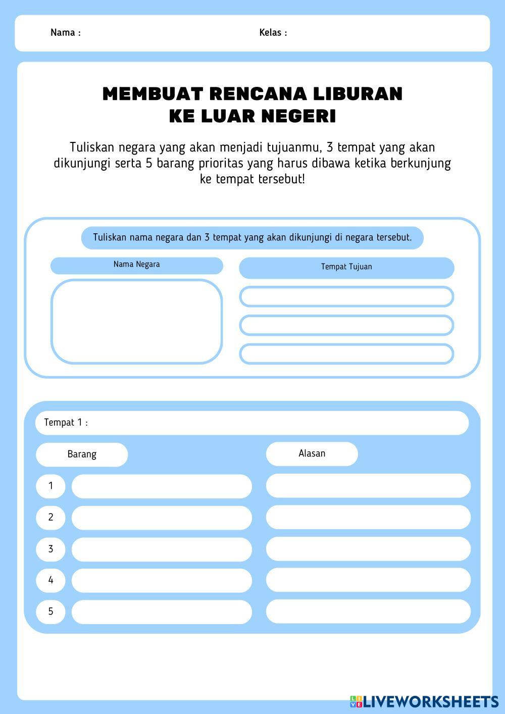 Created by Insfirasion Pembelajaran Skala Prioritas Merencanakan Liburan Age 11-16 level: 6 Indonesian Author's Instructions My Google Classroom Courses × 0 classes selected (0 students total) Quick Access Select all classes (0 classes) All Classes Loading courses... Cancel Share Share to selected Course __COURSE_NAME__ __STUDENT_NAME__ (__STUDENT_EMAIL__) LKPD Rencana Liburan Luar Negeri Download Worksheet Validation Check my answers Emails my answers to my teacher Full name Group/level School subject Teacher's email or key code Close Submit Validating worksheet... (12) Your answers have been sent to your teacher. Good luck! OK We encountered an error submitting your answers. Please try again. OK Advertisement | Go Ad Free Created by Insfirasion Pembelajaran Skala Prioritas Merencanakan Liburan Age 11-16 level: 6 Indonesian Author's Instructions