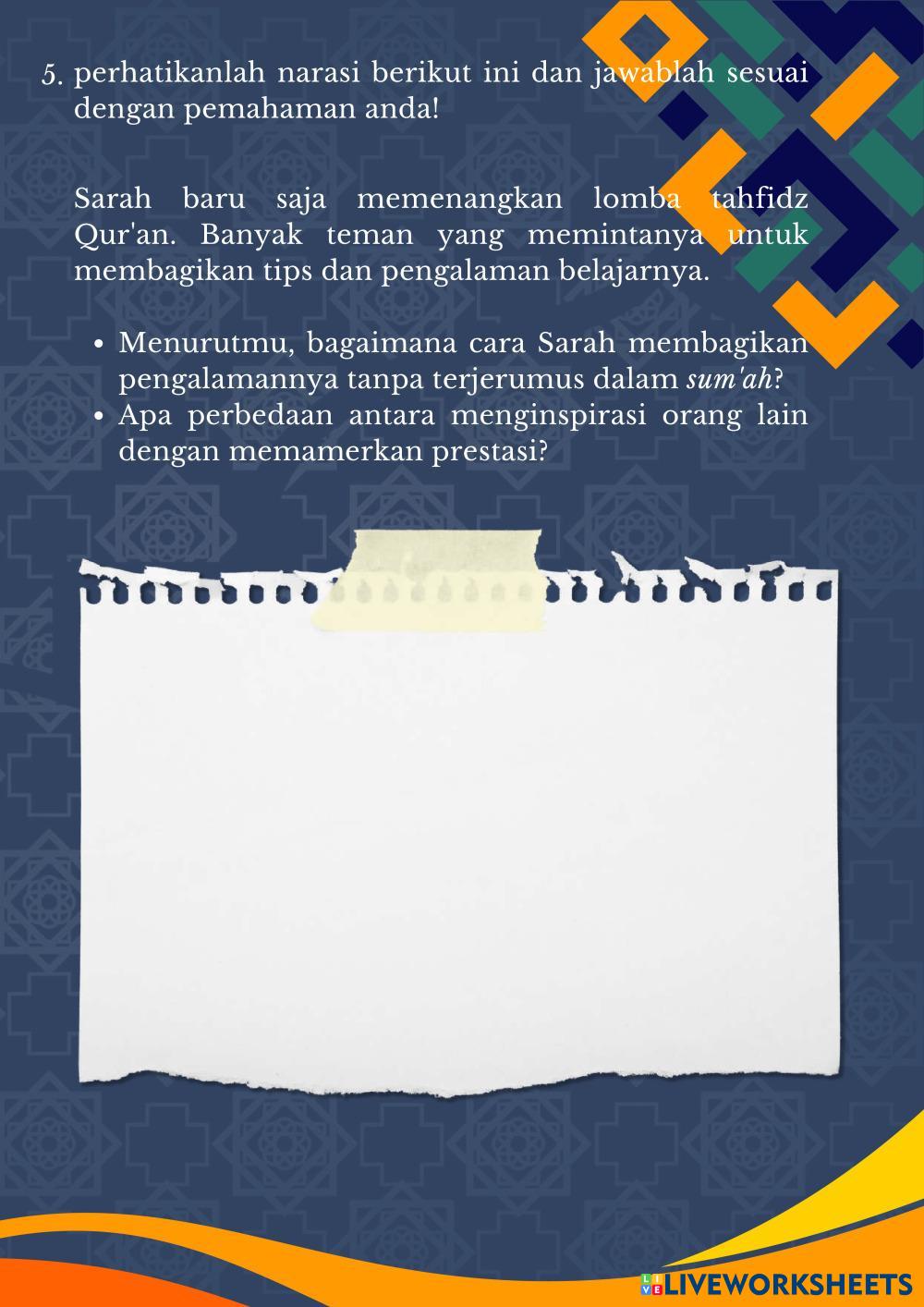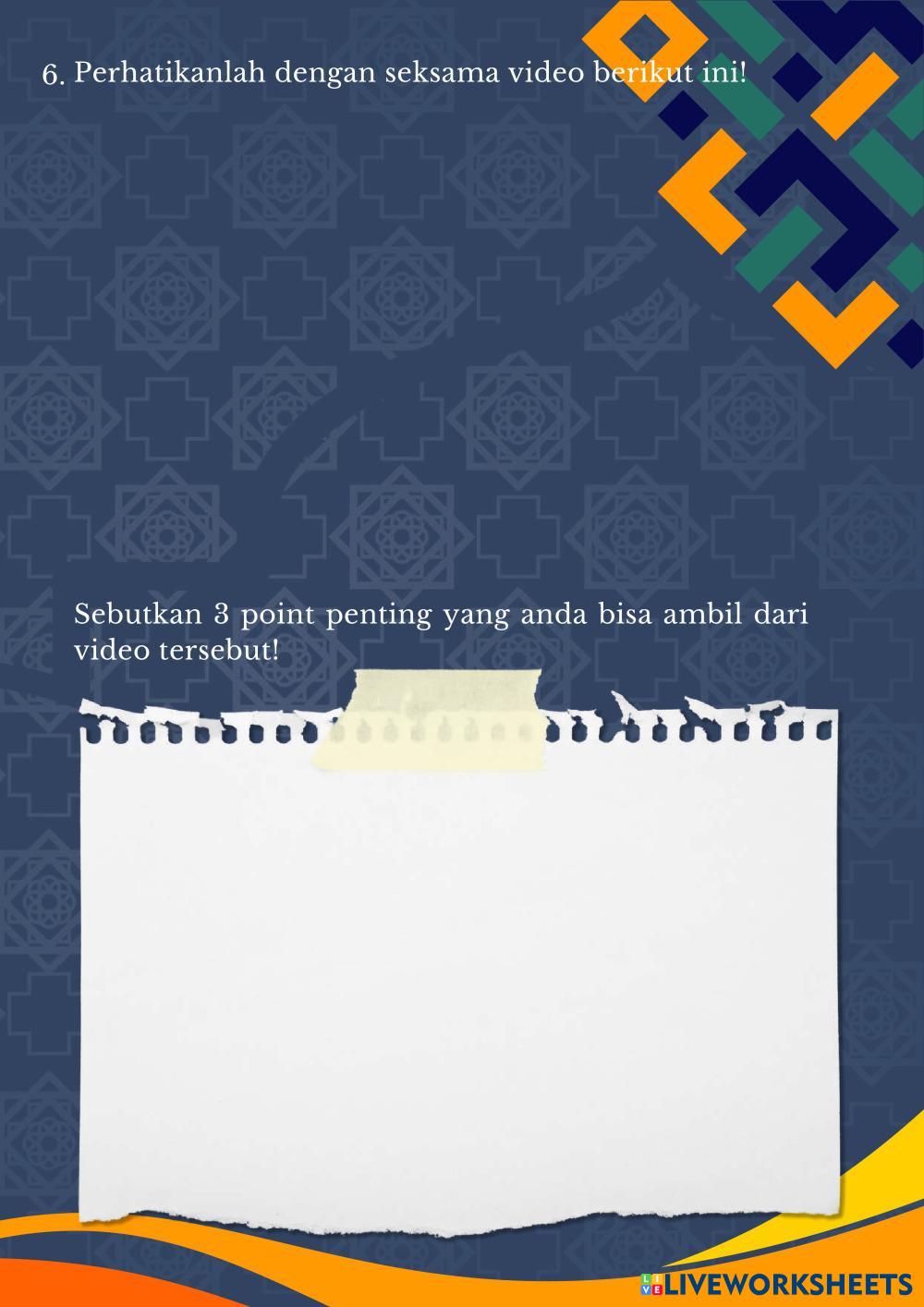 Created byFauzan Rizkiawan Pendidikan Agama Islam Akhlaq Tercela Age 15+ level: 3 Indonesian Author's Instructions My Google Classroom Courses × 0 classes selected (0 students total) Quick Access Select all classes (0 classes) All Classes Loading courses... Cancel Share Share to selected Course __COURSE_NAME__ __STUDENT_NAME__ (__STUDENT_EMAIL__) LKPD INTERAKTIF PAIBP Download Worksheet Validation Check my answers Emails my answers to my teacher Full name Group/level School subject Teacher's email or key code Close Submit Validating worksheet... (12) Your answers have been sent to your teacher. Good luck! OK We encountered an error submitting your answers. Please try again. OK Advertisement | Go Ad Free Created byFauzan Rizkiawan Pendidikan Agama Islam Akhlaq Tercela Age 15+ level: 3 Indonesian Author's Instructions