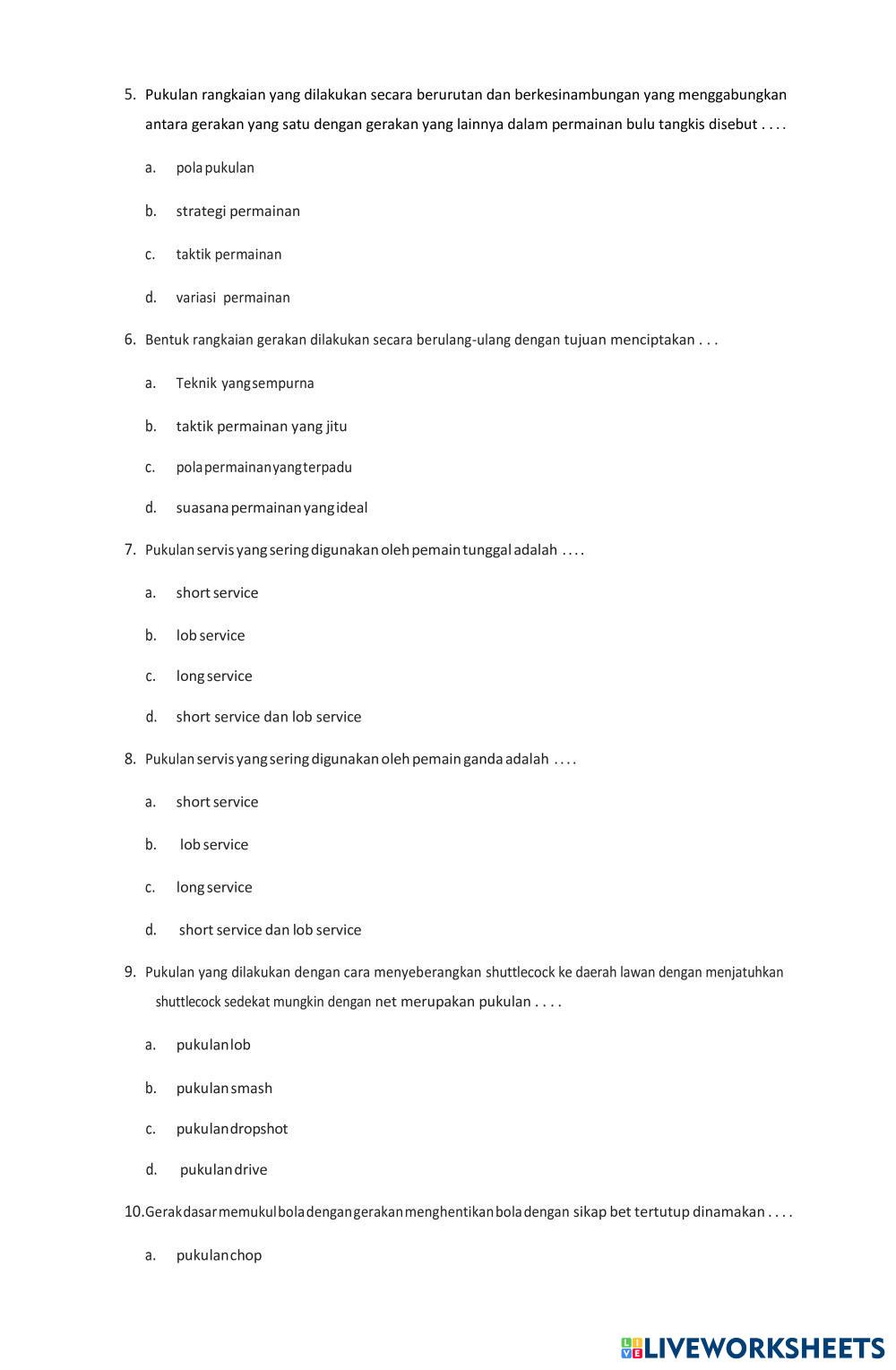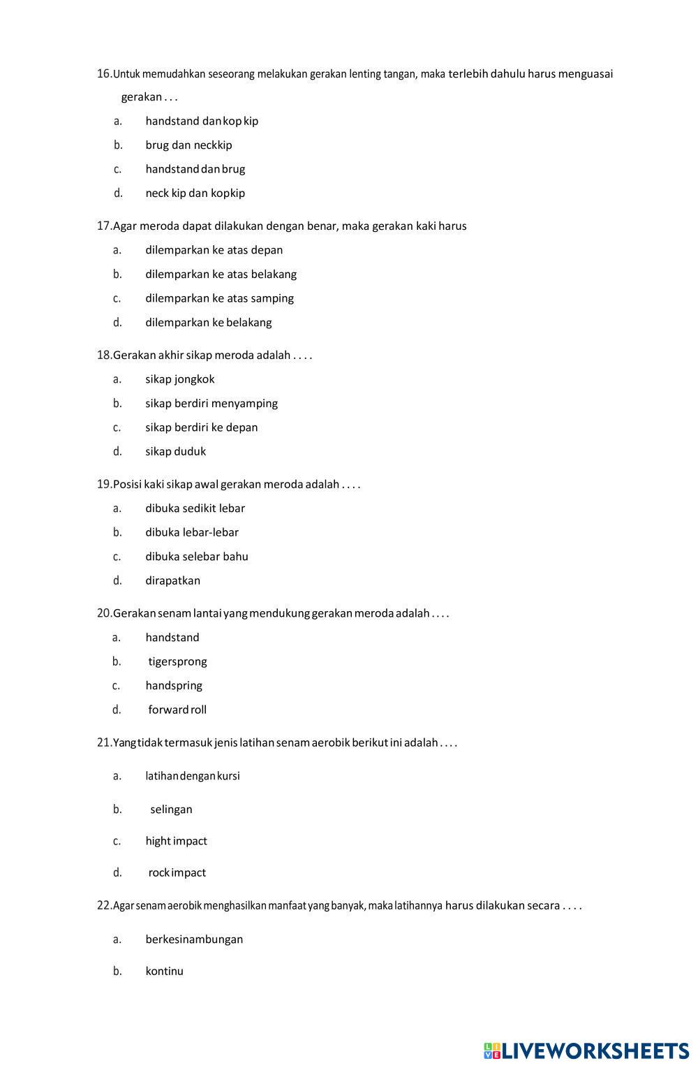 Created by ULPI24 Pendidikan Jasmani Olahraga dan Kesehata PAT 9 GENAP 2024 Age 10+ level: 9 Indonesian Author's Instructions My Google Classroom Courses × 0 classes selected (0 students total) Quick Access Select all classes (0 classes) All Classes Loading courses... Cancel Share Share to selected Course __COURSE_NAME__ __STUDENT_NAME__ (__STUDENT_EMAIL__) PAT PJOK 9 GENAP 2024 Download Worksheet Validation Check my answers Emails my answers to my teacher Full name Group/level School subject Teacher's email or key code Close Submit Validating worksheet... (12) Your answers have been sent to your teacher. Good luck! OK We encountered an error submitting your answers. Please try again. OK Advertisement | Go Ad Free Created by ULPI24 Pendidikan Jasmani Olahraga dan Kesehata PAT 9 GENAP 2024 Age 10+ level: 9 Indonesian Author's Instructions
