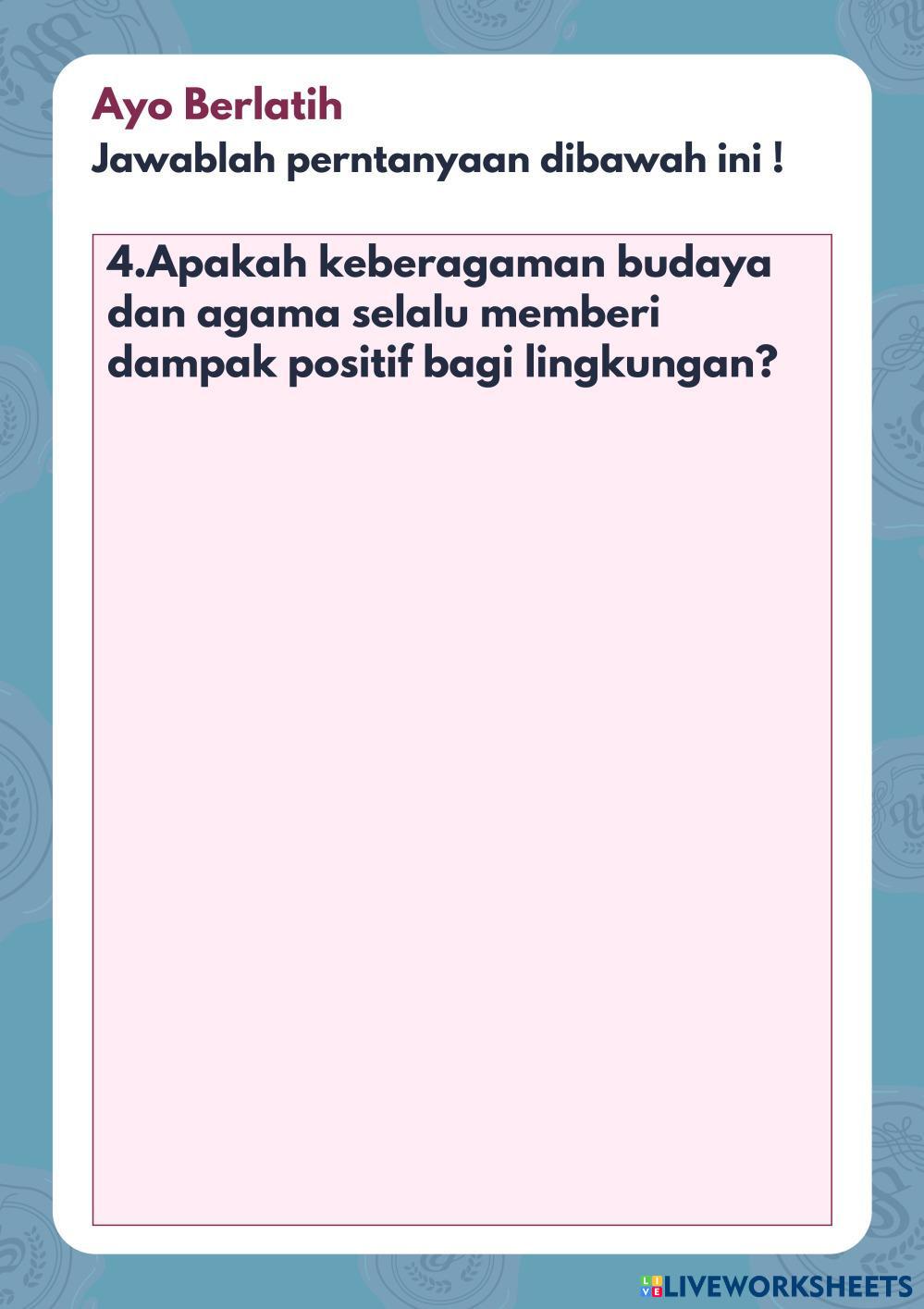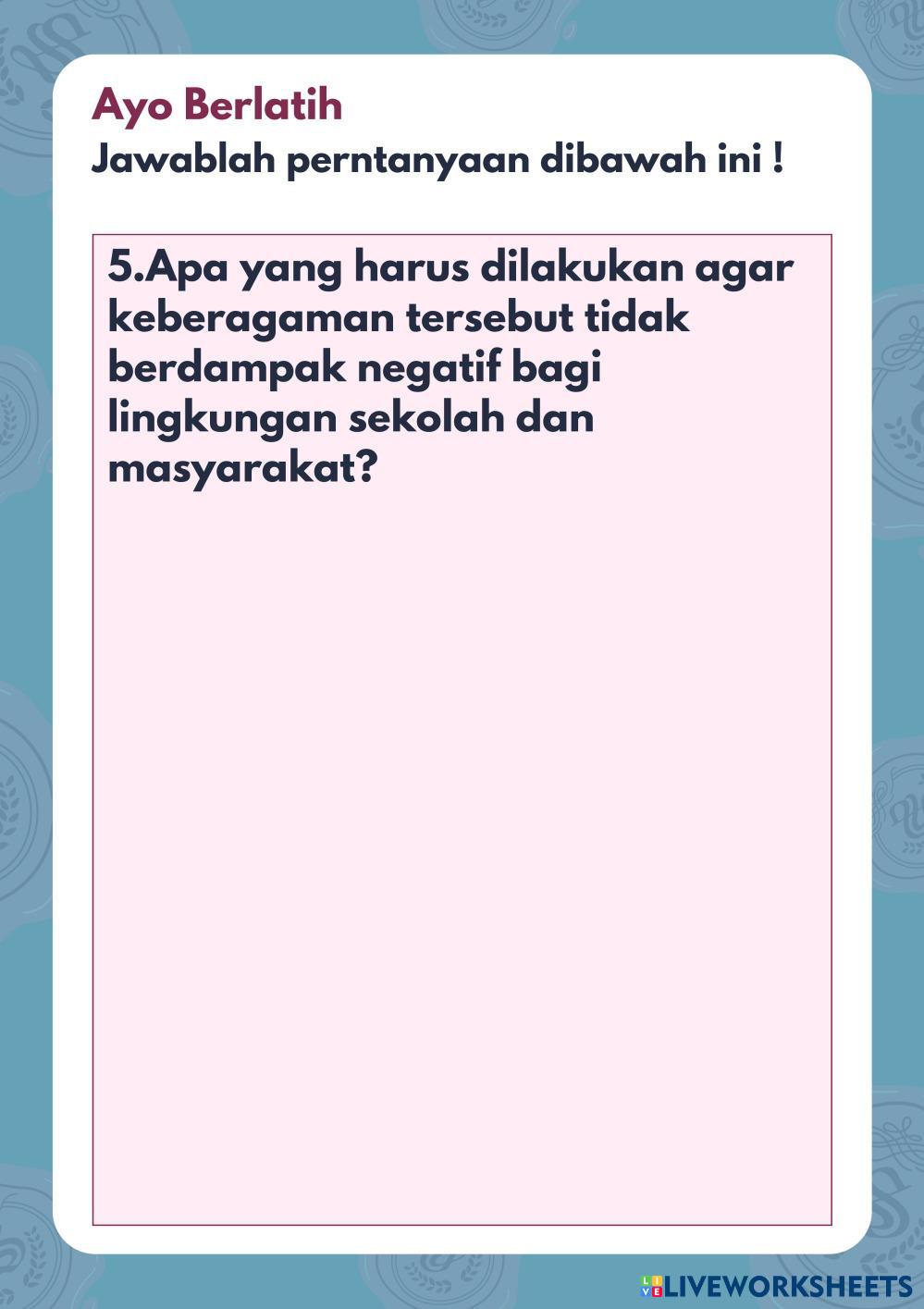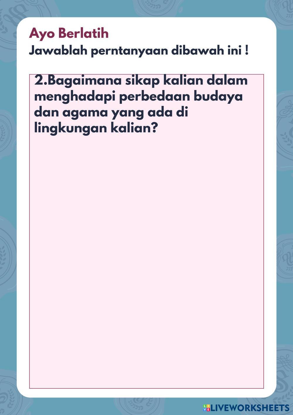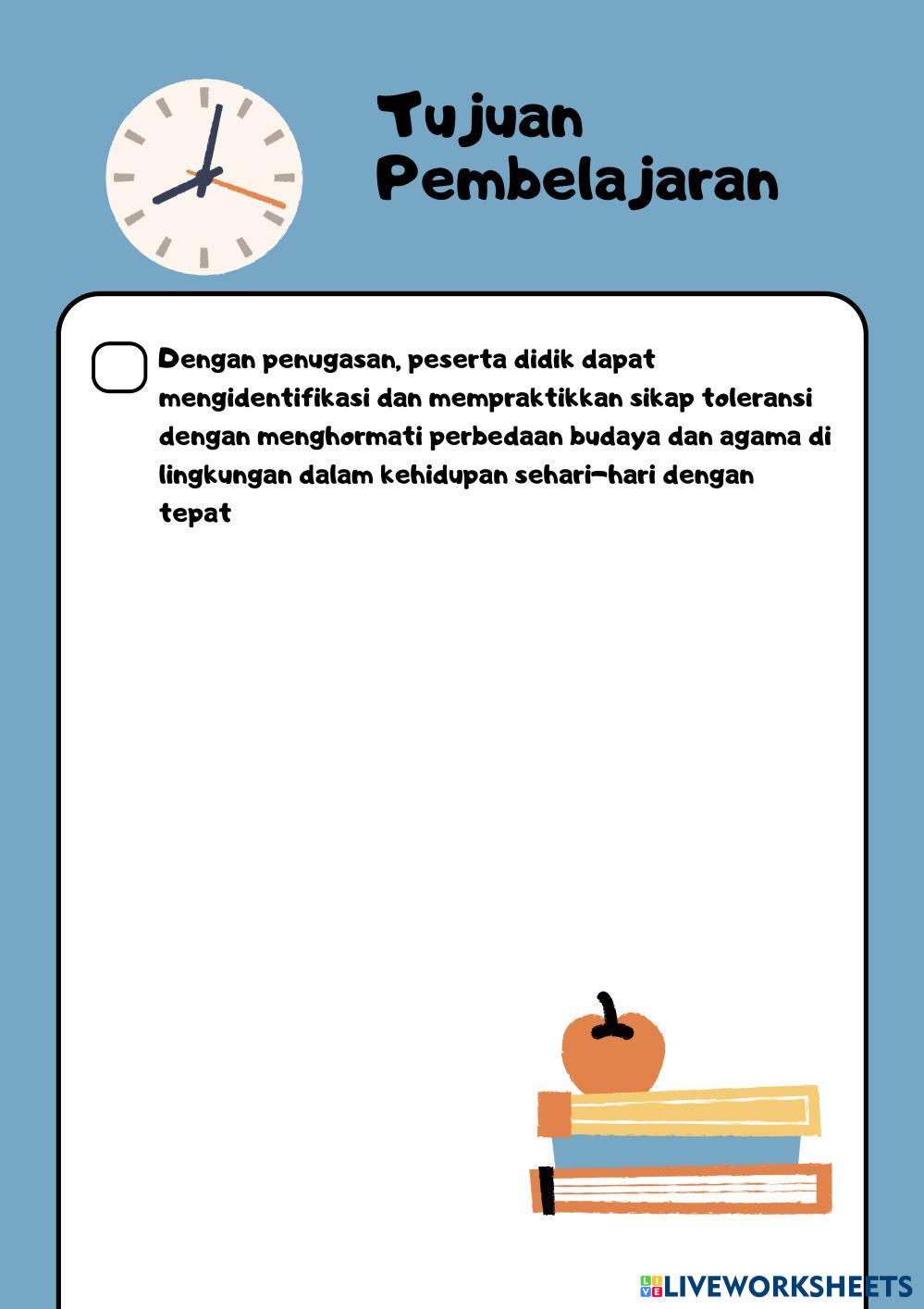 Created byHasanah Pendidikan Pancasila dan Kewarganegaraan (PPKn) Menampilkan sikap sesuai dengan peraturan perundang-undangan Age 11-15 level: 5 Indonesian Author's Instructions My Google Classroom Courses × 0 classes selected (0 students total) Quick Access Select all classes (0 classes) All Classes Loading courses... Cancel Share Share to selected Course __COURSE_NAME__ __STUDENT_NAME__ (__STUDENT_EMAIL__) Lembar Kerja Peserta Didik 1 (Elemen Membaca) Download Worksheet Validation Check my answers Emails my answers to my teacher Full name Group/level School subject Teacher's email or key code Close Submit Validating worksheet... (12) Your answers have been sent to your teacher. Good luck! OK We encountered an error submitting your answers. Please try again. OK Advertisement | Go Ad Free Created byHasanah Pendidikan Pancasila dan Kewarganegaraan (PPKn) Menampilkan sikap sesuai dengan peraturan perundang-undangan Age 11-15 level: 5 Indonesian Author's Instructions
