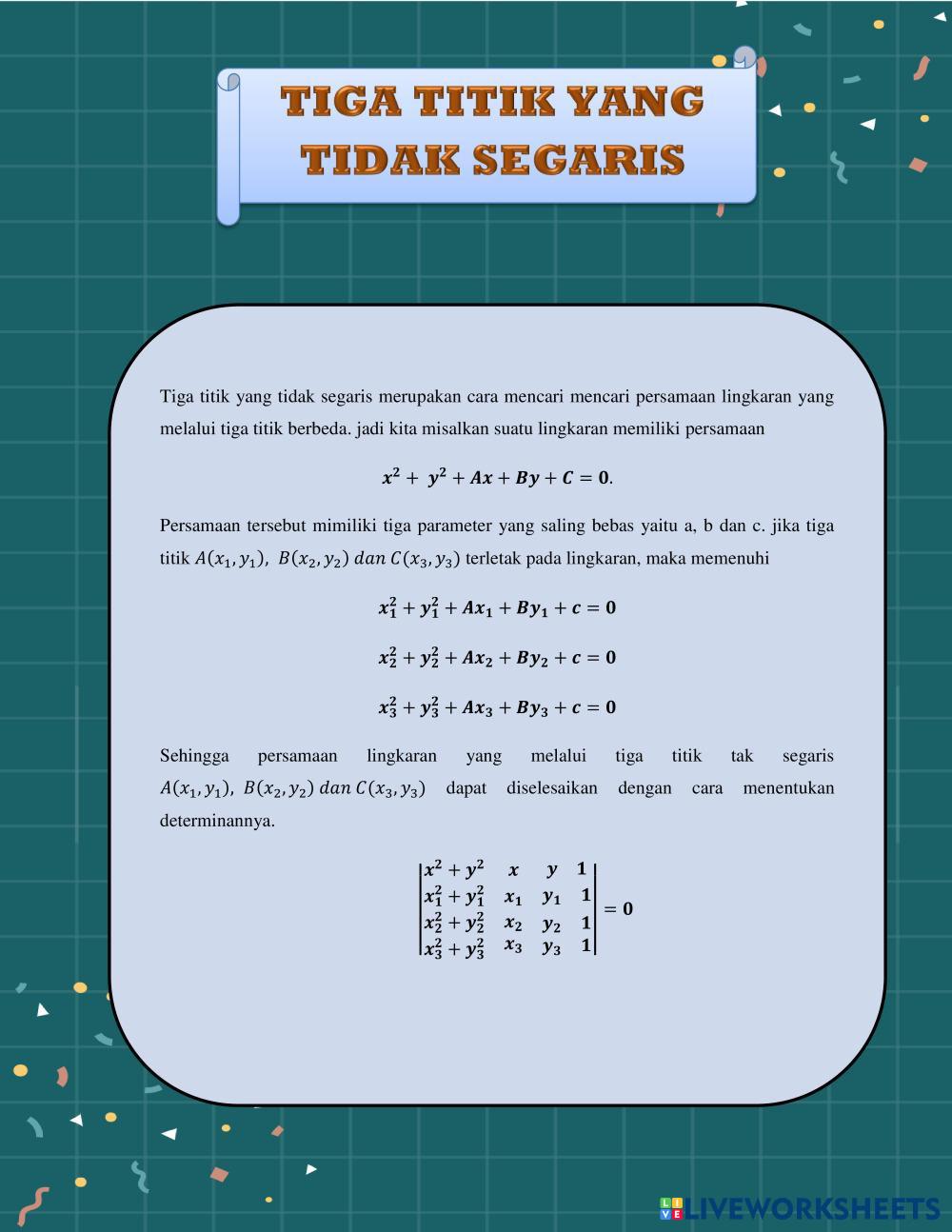 Created byade elpina Persamaan lingkaran dan pgsnya Tiga Titik yang Tidak Segaris Age 17+ level: 11 Indonesian Author's Instructions My Google Classroom Courses × 0 classes selected (0 students total) Quick Access Select all classes (0 classes) All Classes Loading courses... Cancel Share Share to selected Course __COURSE_NAME__ __STUDENT_NAME__ (__STUDENT_EMAIL__) Lingkaran Download Worksheet Validation Check my answers Emails my answers to my teacher Full name Group/level School subject Teacher's email or key code Close Submit Validating worksheet... (12) Your answers have been sent to your teacher. Good luck! OK We encountered an error submitting your answers. Please try again. OK Advertisement | Go Ad Free Created byade elpina Persamaan lingkaran dan pgsnya Tiga Titik yang Tidak Segaris Age 17+ level: 11 Indonesian Author's Instructions