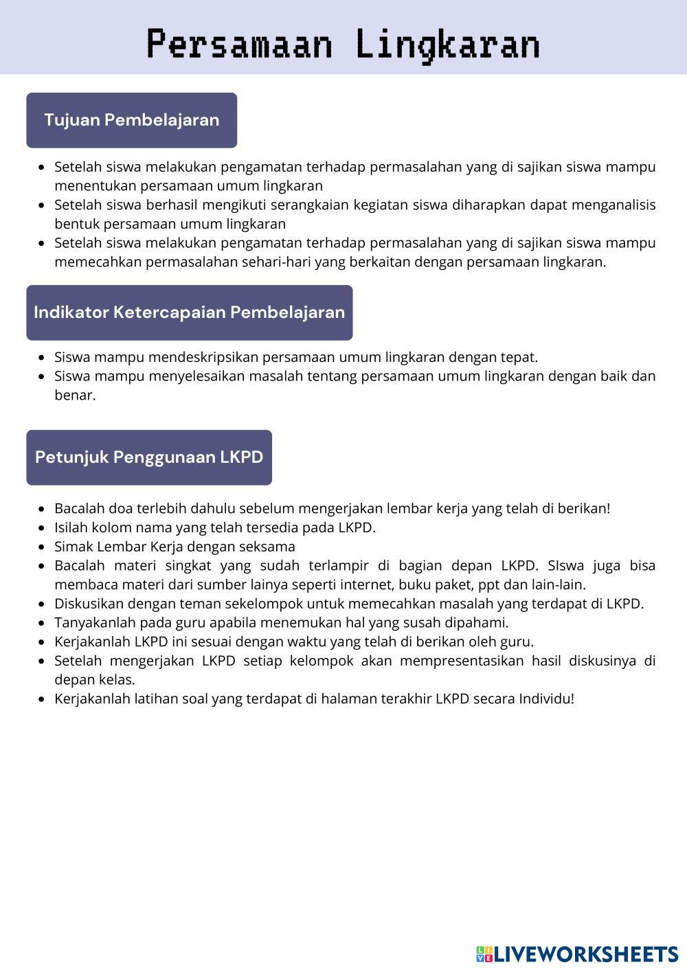 Created bymuthia ghassani Persamaan Lingkaran persamaan lingkaran Age 16+ level: 11 Indonesian Author's Instructions My Google Classroom Courses × 0 classes selected (0 students total) Quick Access Select all classes (0 classes) All Classes Loading courses... Cancel Share Share to selected Course __COURSE_NAME__ __STUDENT_NAME__ (__STUDENT_EMAIL__) LKPD 3 Download Worksheet Validation Check my answers Emails my answers to my teacher Full name Group/level School subject Teacher's email or key code Close Submit Validating worksheet... (12) Your answers have been sent to your teacher. Good luck! OK We encountered an error submitting your answers. Please try again. OK Advertisement | Go Ad Free Created bymuthia ghassani Persamaan Lingkaran persamaan lingkaran Age 16+ level: 11 Indonesian Author's Instructions