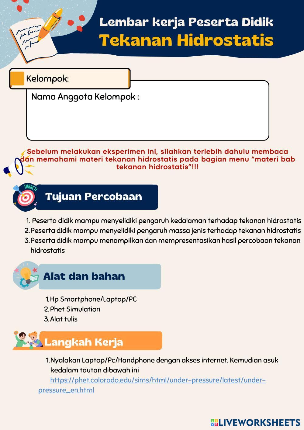Created byElsa S Hanifah Physics Fluida Statis Age 10+ level: 11 Indonesian Author's Instructions My Google Classroom Courses × 0 classes selected (0 students total) Quick Access Select all classes (0 classes) All Classes Loading courses... Cancel Share Share to selected Course __COURSE_NAME__ __STUDENT_NAME__ (__STUDENT_EMAIL__) Lembar Kerja Tekanan Hidrostatis Download Worksheet Validation Check my answers Emails my answers to my teacher Full name Group/level School subject Teacher's email or key code Close Submit Validating worksheet... (12) Your answers have been sent to your teacher. Good luck! OK We encountered an error submitting your answers. Please try again. OK Advertisement | Go Ad Free Created byElsa S Hanifah Physics Fluida Statis Age 10+ level: 11 Indonesian Author's Instructions