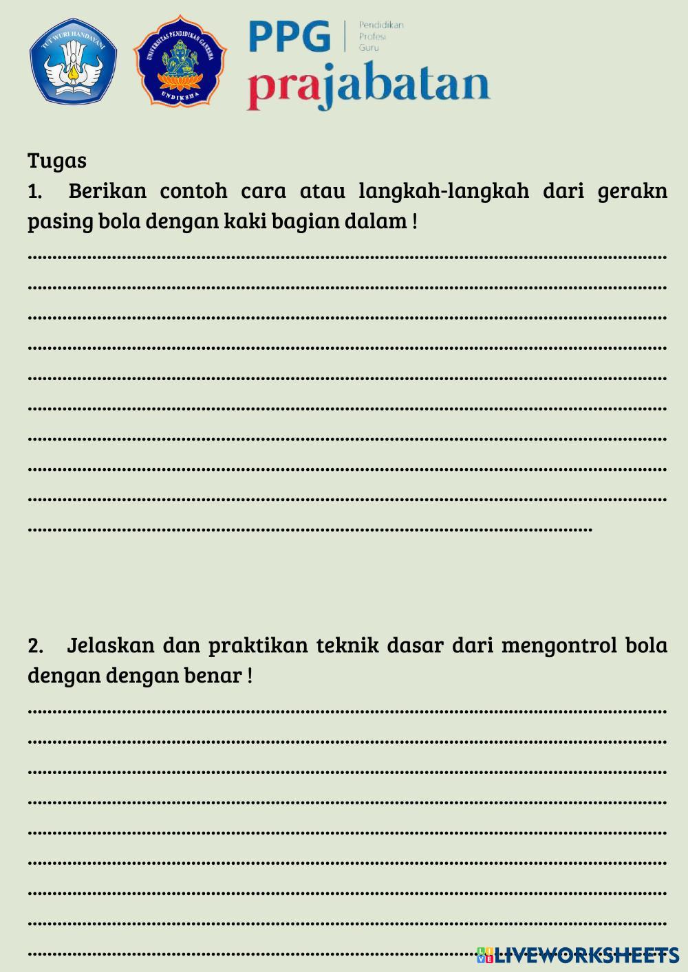 Created byNOBERTUS JUNDENA MBUSA_7 PJOK SMA PERMAINAN SEPAK BOLA Age 15+ level: 10 Indonesian Author's Instructions My Google Classroom Courses × 0 classes selected (0 students total) Quick Access Select all classes (0 classes) All Classes Loading courses... Cancel Share Share to selected Course __COURSE_NAME__ __STUDENT_NAME__ (__STUDENT_EMAIL__) PERMAINAN SEPAK BOLA Download Worksheet Validation Check my answers Emails my answers to my teacher Full name Group/level School subject Teacher's email or key code Close Submit Validating worksheet... (12) Your answers have been sent to your teacher. Good luck! OK We encountered an error submitting your answers. Please try again. OK Advertisement | Go Ad Free Created byNOBERTUS JUNDENA MBUSA_7 PJOK SMA PERMAINAN SEPAK BOLA Age 15+ level: 10 Indonesian Author's Instructions