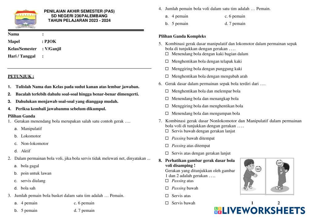 Created byTommi Rizky Kurniawan PJOK Pjok Age 10-14 level: 5 Indonesian Author's Instructions My Google Classroom Courses × 0 classes selected (0 students total) Quick Access Select all classes (0 classes) All Classes Loading courses... Cancel Share Share to selected Course __COURSE_NAME__ __STUDENT_NAME__ (__STUDENT_EMAIL__) PAS PJOK Download Worksheet Validation Check my answers Emails my answers to my teacher Full name Group/level School subject Teacher's email or key code Close Submit Validating worksheet... (12) Your answers have been sent to your teacher. Good luck! OK We encountered an error submitting your answers. Please try again. OK Advertisement | Go Ad Free Created byTommi Rizky Kurniawan PJOK Pjok Age 10-14 level: 5 Indonesian Author's Instructions