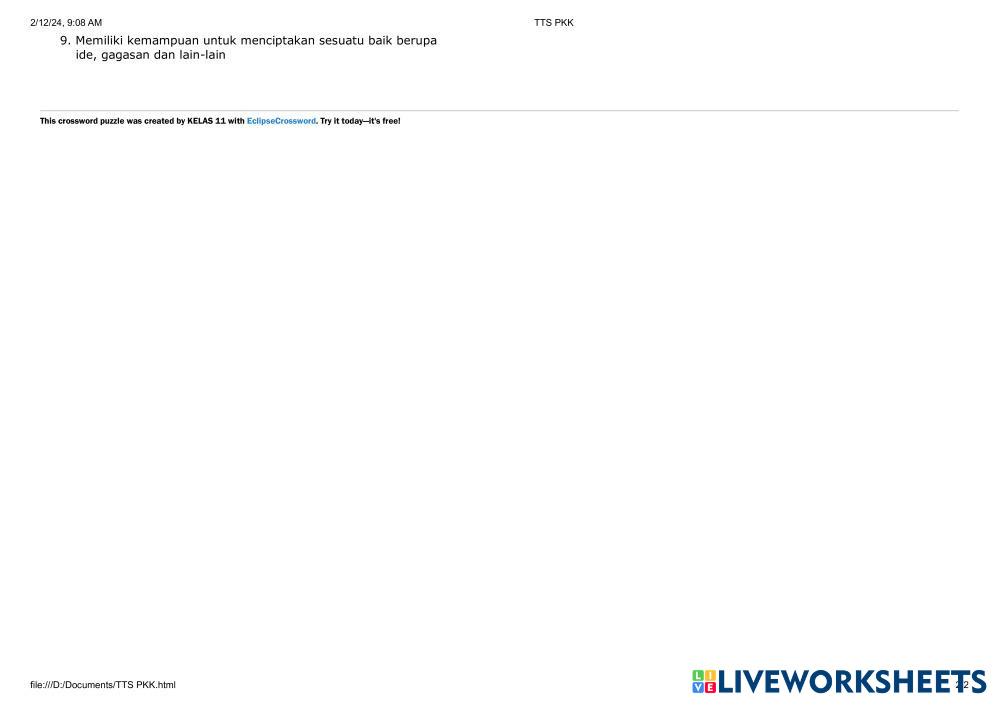 Created bynurhaedah PRODUK KREATIF DAN KEWIRAUSAHAAN Produk kreatif dan kewirausahaan Age 17+ level: FASE F Indonesian Author's Instructions My Google Classroom Courses × 0 classes selected (0 students total) Quick Access Select all classes (0 classes) All Classes Loading courses... Cancel Share Share to selected Course __COURSE_NAME__ __STUDENT_NAME__ (__STUDENT_EMAIL__) PKK KELAS XI Download Worksheet Validation Check my answers Emails my answers to my teacher Full name Group/level School subject Teacher's email or key code Close Submit Validating worksheet... (12) Your answers have been sent to your teacher. Good luck! OK We encountered an error submitting your answers. Please try again. OK Advertisement | Go Ad Free Created bynurhaedah PRODUK KREATIF DAN KEWIRAUSAHAAN Produk kreatif dan kewirausahaan Age 17+ level: FASE F Indonesian Author's Instructions
