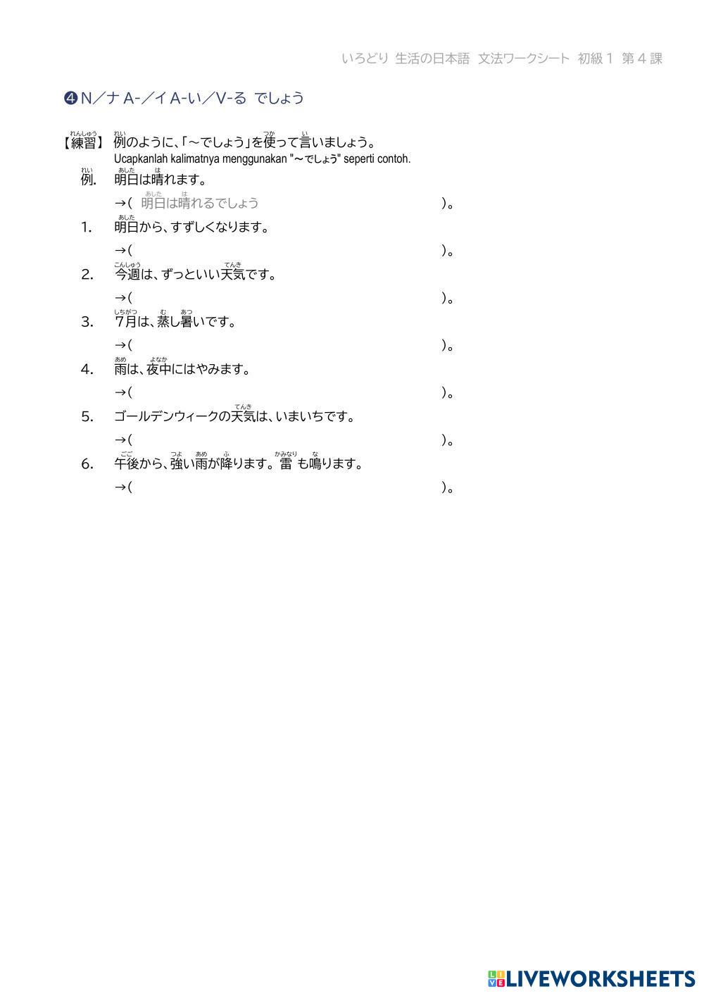 Created byLPK SGM 日本語 日本語 Age 18+ level: N4 Indonesian Author's Instructions My Google Classroom Courses × 0 classes selected (0 students total) Quick Access Select all classes (0 classes) All Classes Loading courses... Cancel Share Share to selected Course __COURSE_NAME__ __STUDENT_NAME__ (__STUDENT_EMAIL__) 第4課「初級1」文法練習問題「いろどり」 Download Worksheet Validation Check my answers Emails my answers to my teacher Full name Group/level School subject Teacher's email or key code Close Submit Validating worksheet... (12) Your answers have been sent to your teacher. Good luck! OK We encountered an error submitting your answers. Please try again. OK Advertisement | Go Ad Free Created byLPK SGM 日本語 日本語 Age 18+ level: N4 Indonesian Author's Instructions