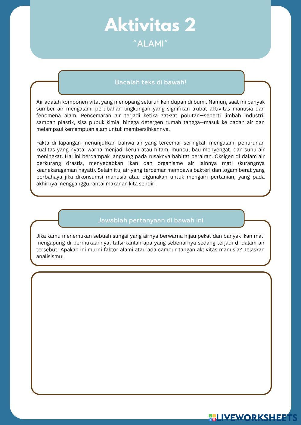 Created by agungary Science High School 10th grade Biology Indonesian Author's Instructions Kerjakan E-LKPD dengan baik dan benar! My Google Classroom Courses × 0 classes selected (0 students total) Quick Access Select all classes (0 classes) All Classes Loading courses... Cancel Share Share to selected Course __COURSE_NAME__ __STUDENT_NAME__ (__STUDENT_EMAIL__) E-LKPD PERUBAHAN LINGKUNGAN PERTEMUAN 1 Download Worksheet Validation Check my answers Emails my answers to my teacher Full name Group/level School subject Teacher's email or key code Close Submit Validating worksheet... (12) Your answers have been sent to your teacher. Good luck! OK We encountered an error submitting your answers. Please try again. OK Advertisement | Go Ad Free Created by agungary Science High School 10th grade Biology Indonesian Author's Instructions Kerjakan E-LKPD dengan baik dan benar! Explore Worksheets Pencemaran Air Science 10th grade Pencemaran Air Biology - Science LKPD ini dirancang untuk memfasilitasi saudara dalam melakukan kegiatan pembelajaran secara mandiri maupun kelompok. LKPD ini berbasis PBL (Problem Based Learning) dirancang untuk melatih kemampuan literasi sains peserta didik. Konten yang terdapat pada LKPD ini diantara berupa pertanyaan dan kegiatan siswa dalam proses pembelajaran. Bacalah terlebih dahulu permasalahan yang ada. Kemudian pahami uraian pengantar materi dengan membacanya secara seksama dan teliti. Jawablah pertanyaan yang ada dalam LKPD ini dengan tepat. pencemaran tanah Science 10th grade pencemaran tanah Biology - Science Lembar kerja ini dikerjakan secara berkelompok (4-5 orang per kelompok). Carilah berbagai informasi yang relevan terkait masalah perubahan dan pelestarian lingkungan. Diskusikan dan kerjakan Lembar Kerja Peserta Didik (LKPD) sesuai dengan waktu yang ditentukan. Isilah lembar Lembar Kerja Peserta Didik (LKPD) dengan tepat dan jelaskan الكائنات ذاتية التغذية Science 10th grade الكائنات ذاتية التغذية Biology - Science بالاستعانة بالكتاب المدرسي ص 54 اجيبي عن الأسئلة E-LKPD PERUBAHAN LINGKUNGAN PERTEMUAN 3 Science 10th grade E-LKPD PERUBAHAN LINGKUNGAN PERTEMUAN 3 Biology - Science Kerjakan E-LKPD dengan baik dan benar