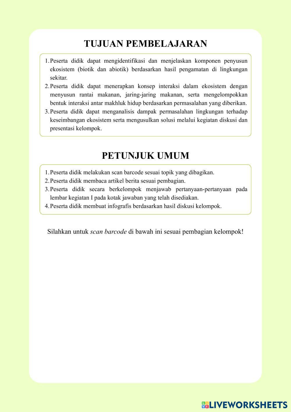 Created by ainunisshofiyyah Science High School 10th grade Biology Indonesian Author's Instructions KERJAKAN SESUAI INSTRUKSI My Google Classroom Courses × 0 classes selected (0 students total) Quick Access Select all classes (0 classes) All Classes Loading courses... Cancel Share Share to selected Course __COURSE_NAME__ __STUDENT_NAME__ (__STUDENT_EMAIL__) LKPD EKOSISTEM Download Worksheet Validation Check my answers Emails my answers to my teacher Full name Group/level School subject Teacher's email or key code Close Submit Validating worksheet... (12) Your answers have been sent to your teacher. Good luck! OK We encountered an error submitting your answers. Please try again. OK Advertisement | Go Ad Free Created by ainunisshofiyyah Science High School 10th grade Biology Indonesian Author's Instructions KERJAKAN SESUAI INSTRUKSI Explore Worksheets soal posttest_projek kelapa_new Science 10th grade soal posttest_projek kelapa_new Biology - Science siswa mampu merencanakan projek hingga mengevaluasi projek produk kelapa Solusi Pemanasan Global Science 10th grade Solusi Pemanasan Global Biology - Science Silahkan baca dan ikuti arahan pada LKPD berikut ya! ใบงาน เรื่อง การลำเลียงสารเข้าและออกจากเซลล์ Science 10th grade ใบงาน เรื่อง การลำเลียงสารเข้าและออกจากเซลล์ Biology - Science จุดประสงค์การเรียนรู้ 1. อธิบายและเปรียบเทียบการลำเลียงสารเข้าและออกจากเซลล์โดยการแพร่แบบธรรมดา ออสโมซิส การแพร่แบบฟาซิลิเทต แอกทีฟทรานสปอร์ต เอนโดไซโทซิส และเอกโซไซโทซิส آكلات الأعشاب Science 10th grade آكلات الأعشاب Biology - Science قارني بين نوعي آكلات الأعشاب من حيث