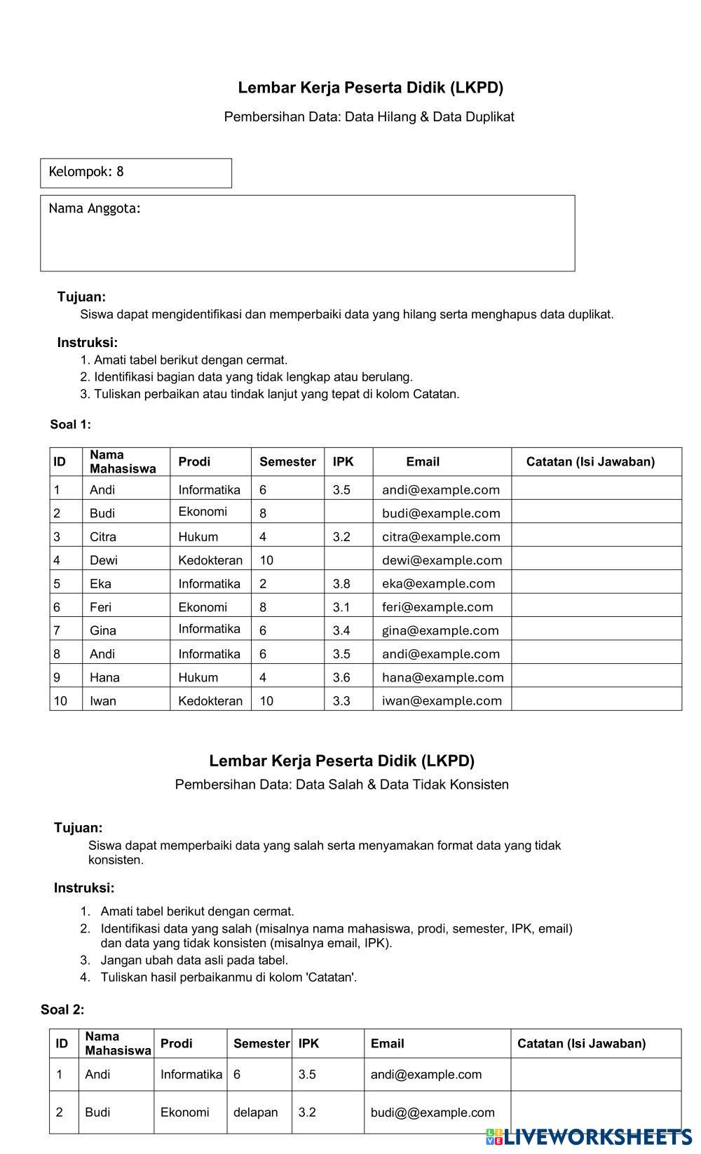 Jika ada data salah format (contoh: email), tulis perbaikan di kolom Catatan.