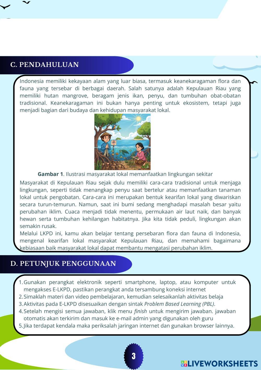 selamat datang kepada peserta didik dalam E-LKPD persebaran flora dan fauna di Kepulauan Riau bermuatan etnosains.