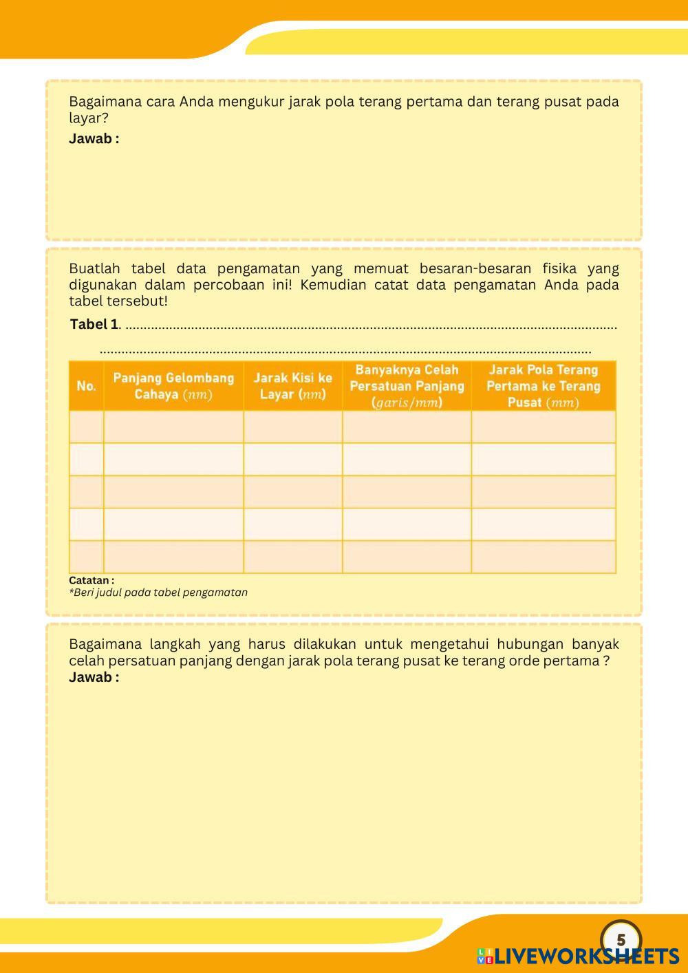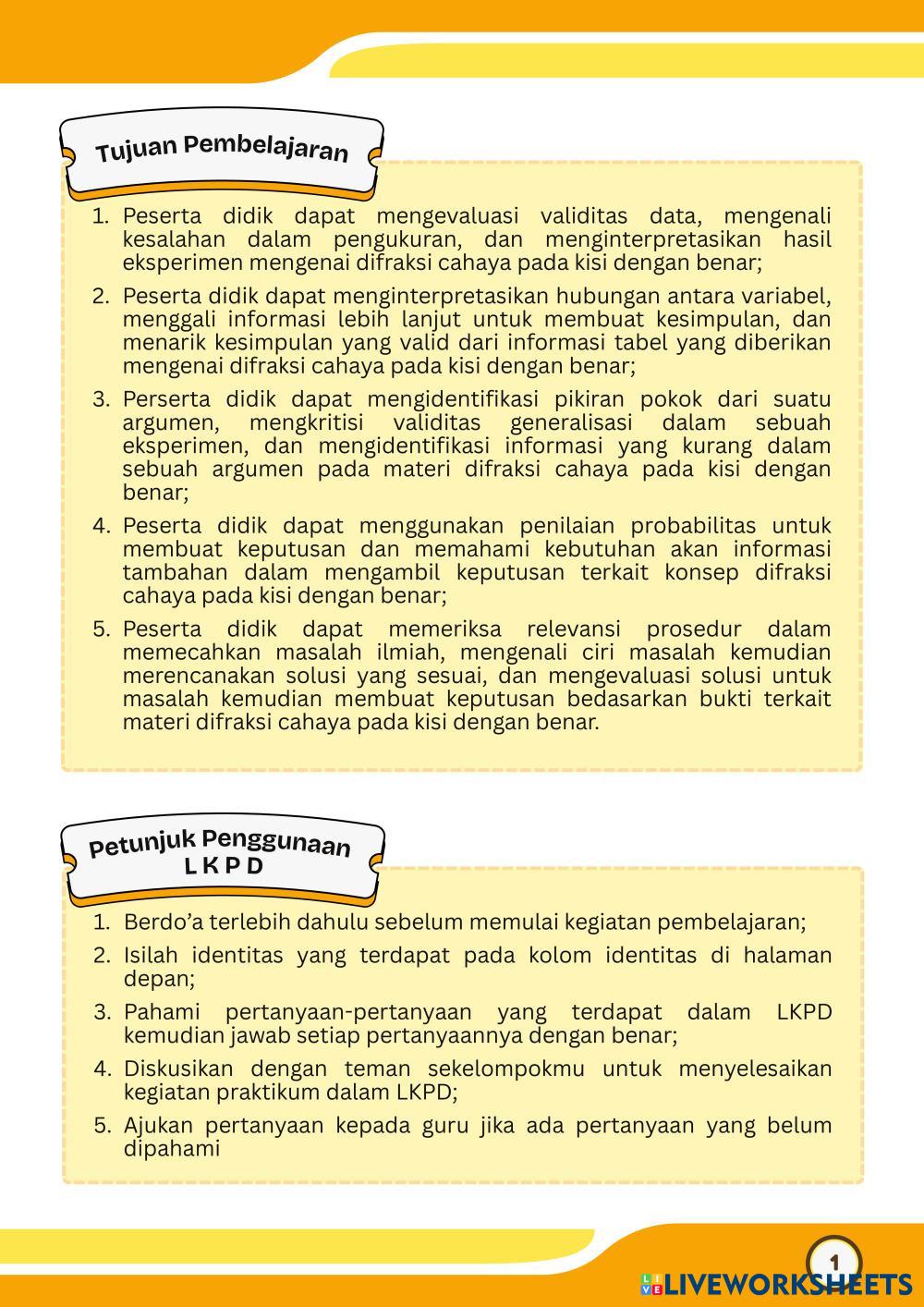 LKPD ini dikerjakan secara individual, artinya setiap peserta didik menjawab dan mengerjakannya secara masing-masing. Adapun pengambilan data pengamatan pada setiap percobaan secara berkelompok.