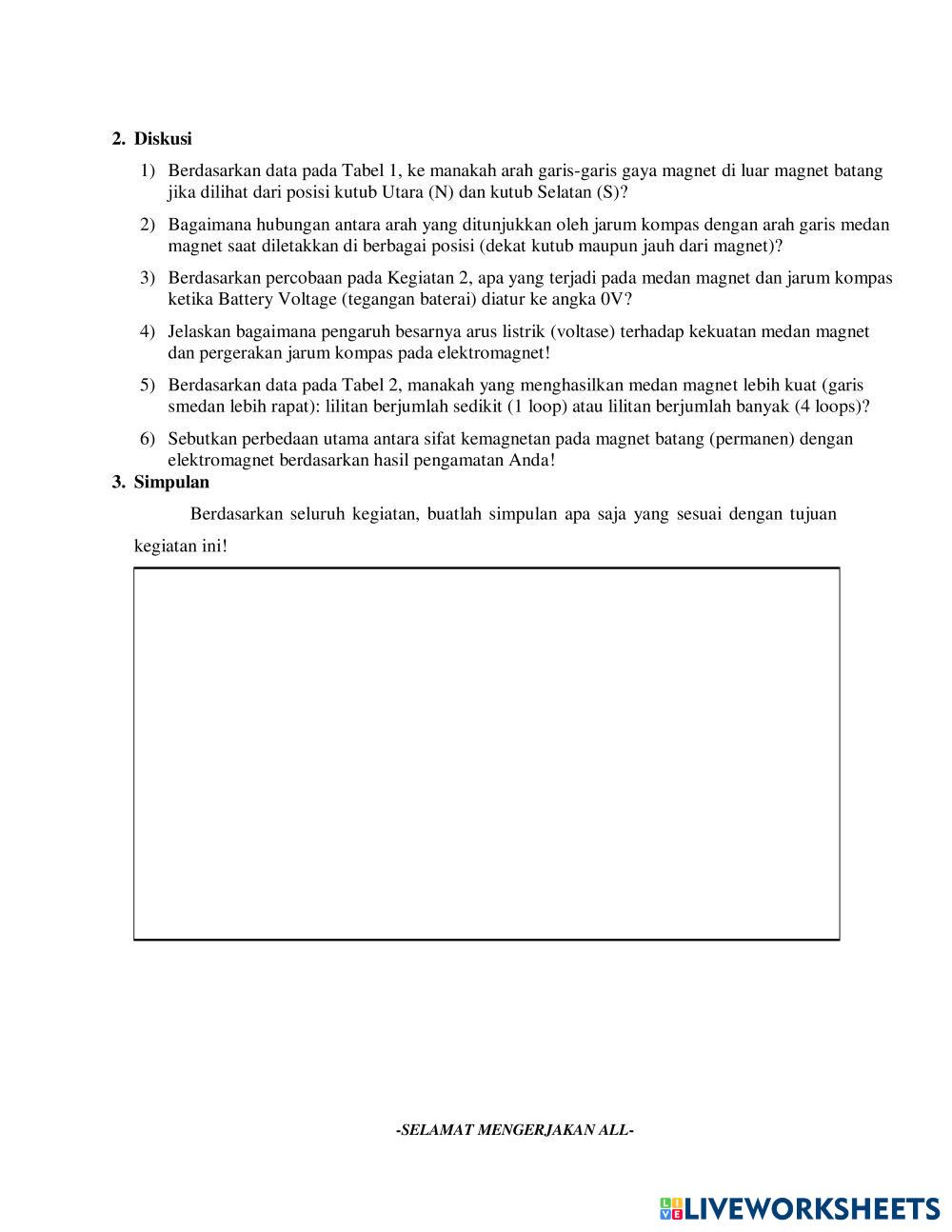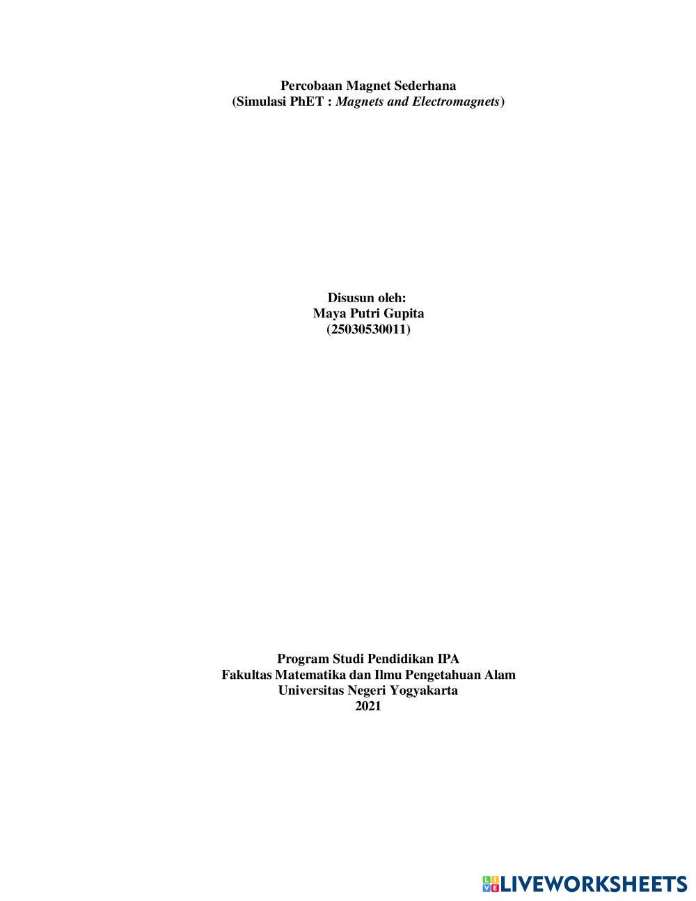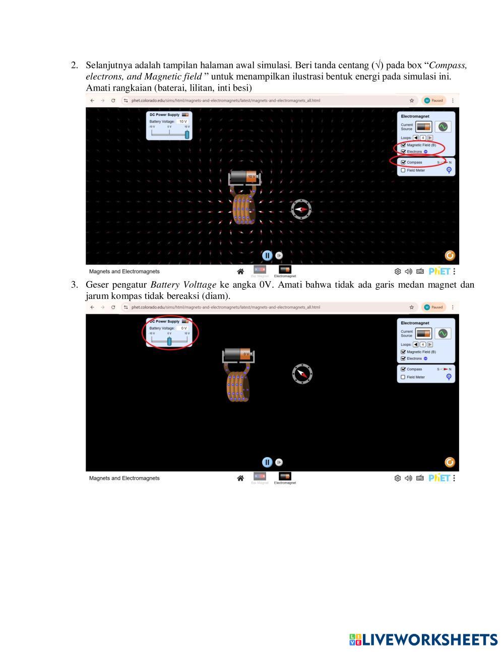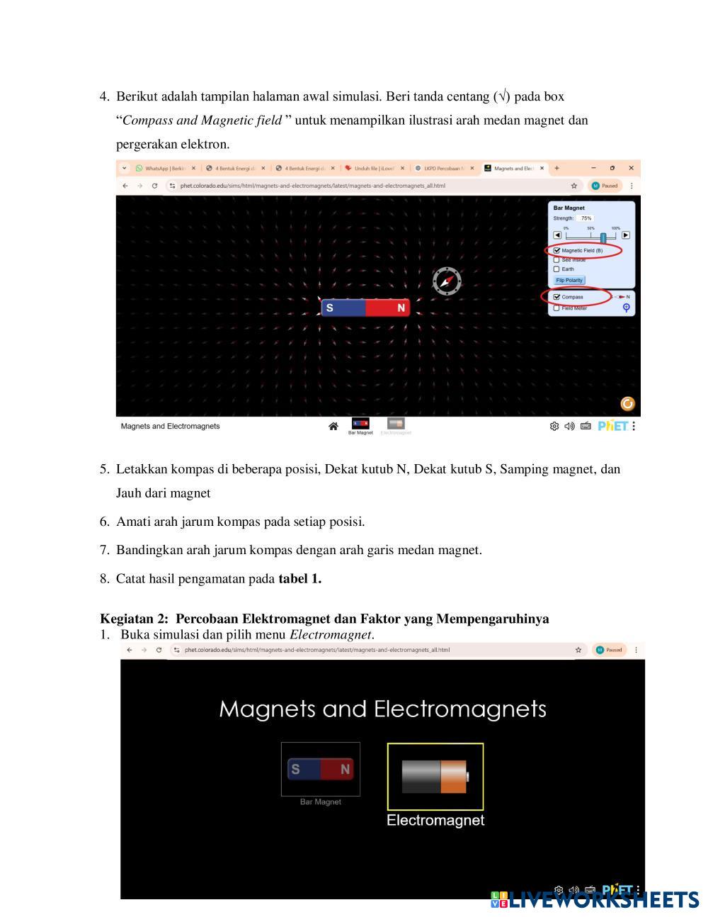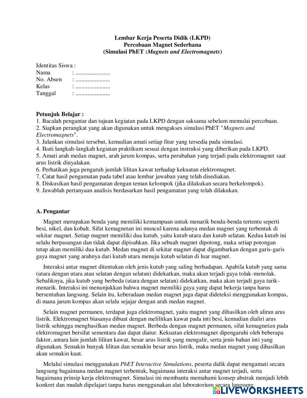 Siswa diminta untuk mengerjakan LKPD tentang Magnet Sederhana dengan menggunakan simulasi PhET Interactive Simulations pada menu Magnets and Electromagnets. Bacalah setiap petunjuk dengan teliti, kemudian jalankan simulasi dan amati komponen yang tersedia seperti magnet batang, kompas, kumparan, serta sumber arus listrik. Ikuti langkah-langkah percobaan yang telah disusun secara sistematis, lakukan pengamatan dengan cermat, dan catat setiap hasil yang diperoleh pada tabel yang tersedia di LKPD. Jawablah seluruh pertanyaan berdasarkan hasil pengamatan dan pemahaman konsep yang telah dipelajari. Apabila diperlukan, lakukan diskusi dengan teman untuk memperkuat pemahaman. Gunakan bahasa yang jelas dan sesuai kaidah ilmiah, serta periksa kembali jawaban sebelum mengumpulkan LKPD sesuai waktu yang telah ditentukan.