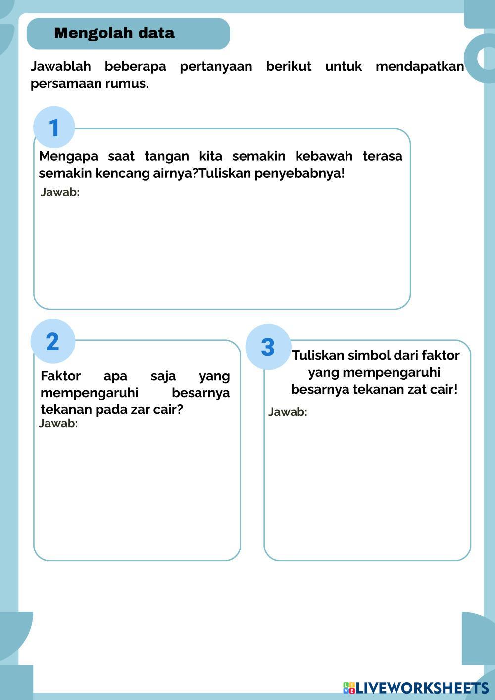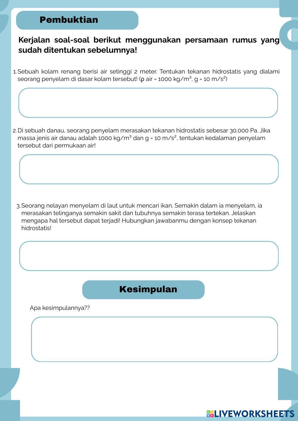 Created byAna Widy Astuti Science High School 12th grade Physics Indonesian Author's Instructions LKPD Tekanan Hidrostatis My Google Classroom Courses × 0 classes selected (0 students total) Quick Access Select all classes (0 classes) All Classes Loading courses... Cancel Share Share to selected Course __COURSE_NAME__ __STUDENT_NAME__ (__STUDENT_EMAIL__) Tekanan Hidrostatis Download Worksheet Validation Check my answers Emails my answers to my teacher Full name Group/level School subject Teacher's email or key code Close Submit Validating worksheet... (12) Your answers have been sent to your teacher. Good luck! OK We encountered an error submitting your answers. Please try again. OK Advertisement | Go Ad Free Created byAna Widy Astuti Science High School 12th grade Physics Indonesian Author's Instructions LKPD Tekanan Hidrostatis Explore Worksheets worksheet physics Science 12th grade worksheet physics Physics - Science worksheet physics worksheet physics Science 12th grade worksheet physics Physics - Science worksheet physics FACUNDO Y CAMILA Science 12th grade FACUNDO Y CAMILA Physics - Science Completar la secuencia correcta, arrastrando las opciones al lugar que corresponde. FUERZAS FUNDAMENTALES Science 12th grade FUERZAS FUNDAMENTALES Physics - Science FUERZAS FUNDAMENTALES