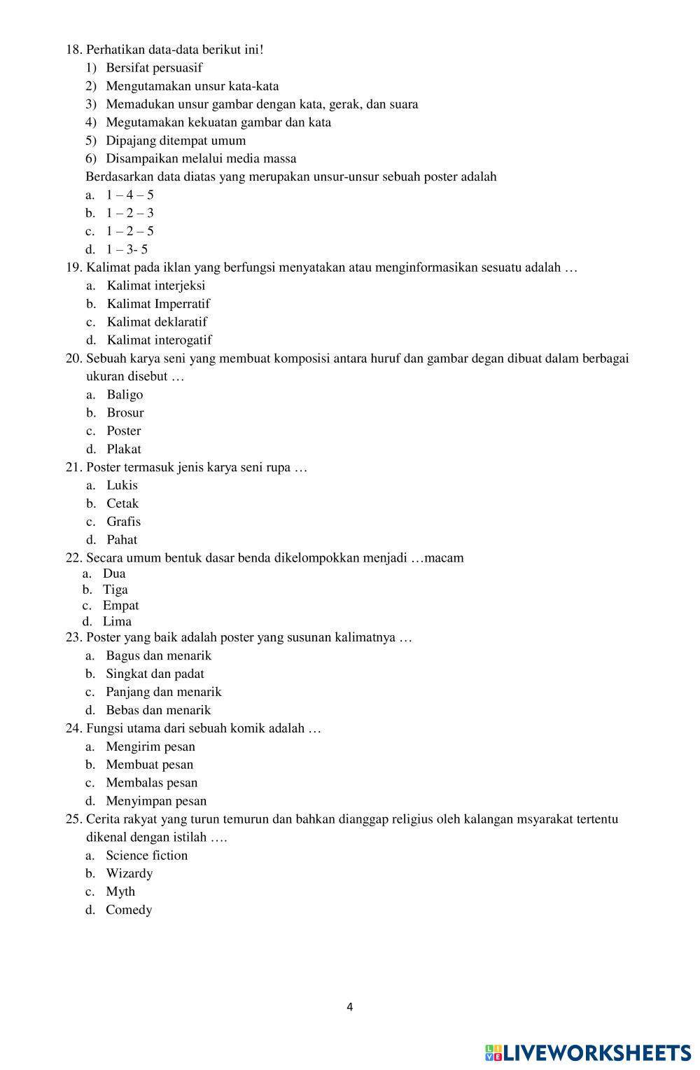Created by mtsmbh04 Seni Budaya Soal pat seni budaya kelas 8 Age 12-18 level: 8 Indonesian Author's Instructions SOAL PAT SENI BUDAYA KELAS 8 My Google Classroom Courses × 0 classes selected (0 students total) Quick Access Select all classes (0 classes) All Classes Loading courses... Cancel Share Share to selected Course __COURSE_NAME__ __STUDENT_NAME__ (__STUDENT_EMAIL__) SOAL PAT SENI BUDAYA KELAS 8 Download Worksheet Validation Check my answers Emails my answers to my teacher Full name Group/level School subject Teacher's email or key code Close Submit Validating worksheet... (12) Your answers have been sent to your teacher. Good luck! OK We encountered an error submitting your answers. Please try again. OK Advertisement | Go Ad Free Created by mtsmbh04 Seni Budaya Soal pat seni budaya kelas 8 Age 12-18 level: 8 Indonesian Author's Instructions SOAL PAT SENI BUDAYA KELAS 8