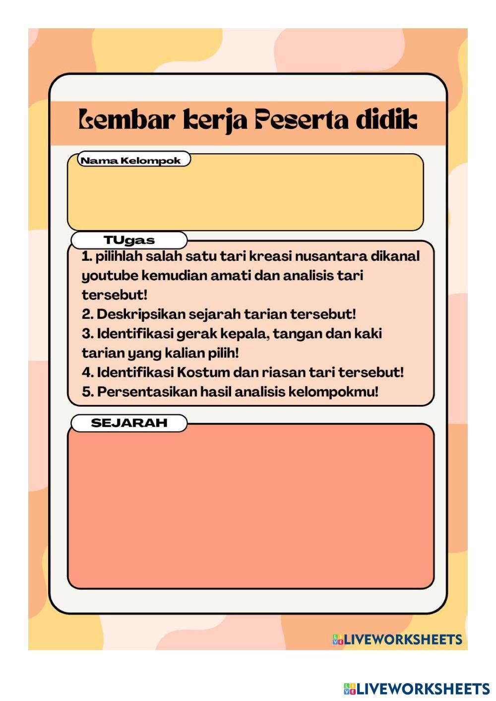 Created byNeneng Siti Sopiah SENI TARI TARI KREASI Age 16+ level: 11 Indonesian Author's Instructions TARI KREASI My Google Classroom Courses × 0 classes selected (0 students total) Quick Access Select all classes (0 classes) All Classes Loading courses... Cancel Share Share to selected Course __COURSE_NAME__ __STUDENT_NAME__ (__STUDENT_EMAIL__) LKPD TARI KREASI Download Worksheet Validation Check my answers Emails my answers to my teacher Full name Group/level School subject Teacher's email or key code Close Submit Validating worksheet... (12) Your answers have been sent to your teacher. Good luck! OK We encountered an error submitting your answers. Please try again. OK Advertisement | Go Ad Free Created byNeneng Siti Sopiah SENI TARI TARI KREASI Age 16+ level: 11 Indonesian Author's Instructions TARI KREASI