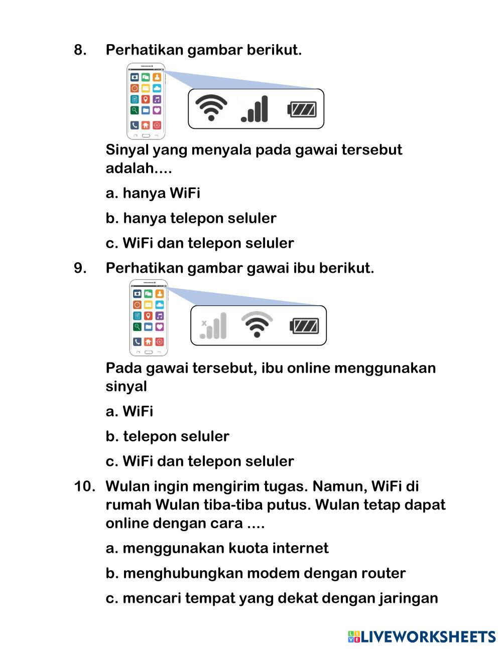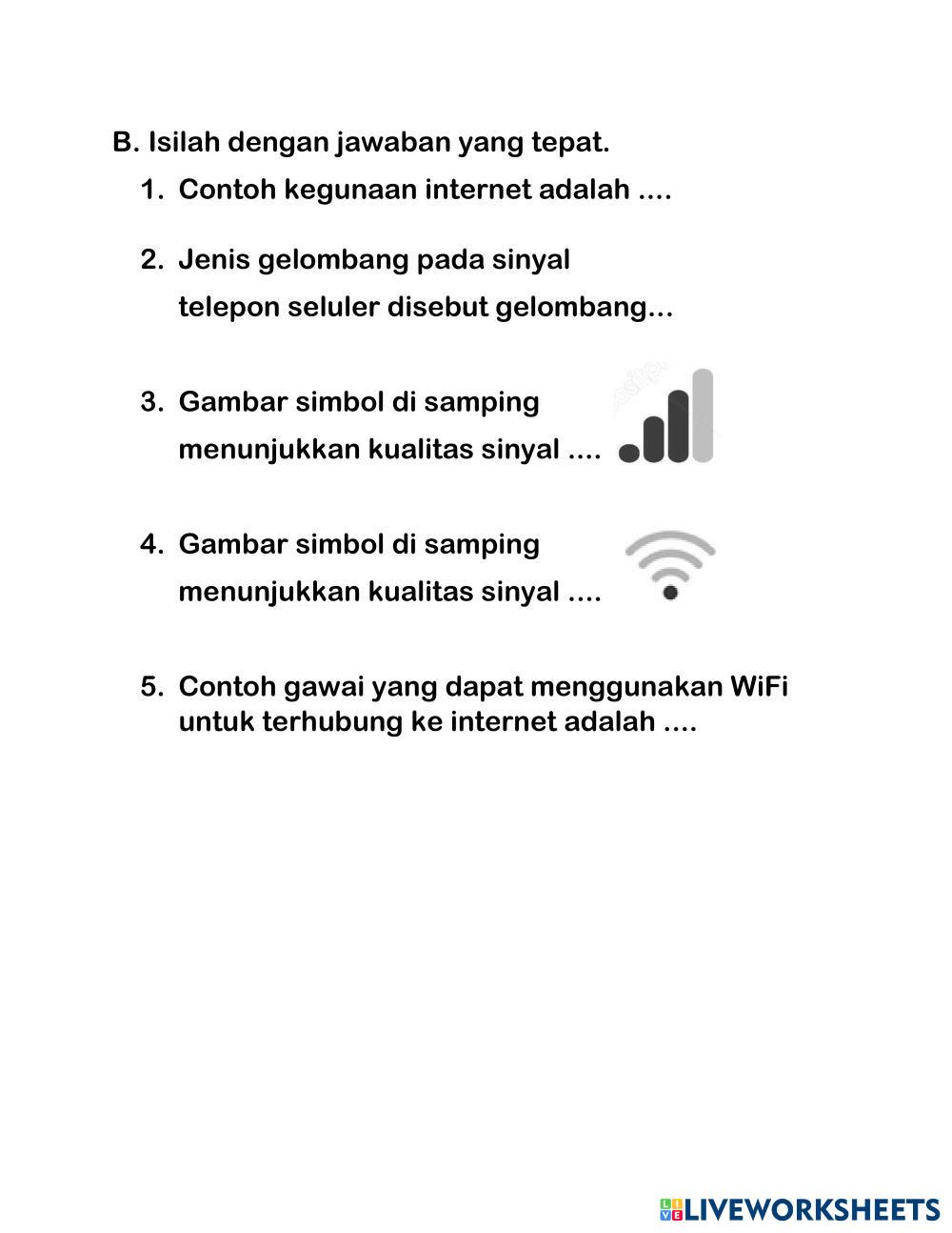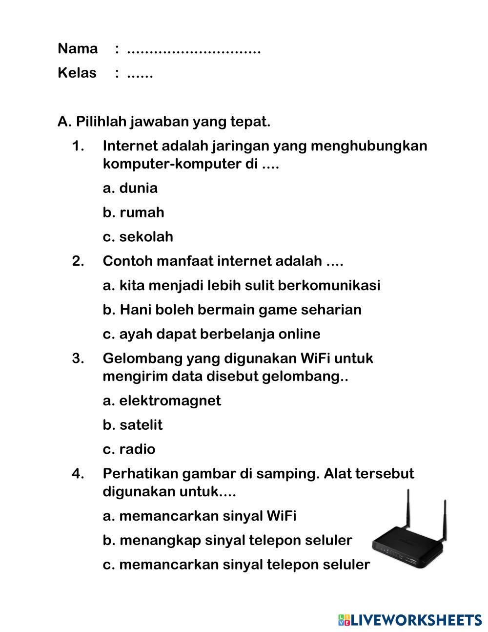 Created byJafar Sidik sinyal telepon dan wifi Teknik jaringan komputer Age 7-11 level: 2 Indonesian Author's Instructions My Google Classroom Courses × 0 classes selected (0 students total) Quick Access Select all classes (0 classes) All Classes Loading courses... Cancel Share Share to selected Course __COURSE_NAME__ __STUDENT_NAME__ (__STUDENT_EMAIL__) Soal Sinyal Telepon dan WIFI Download Worksheet Validation Check my answers Emails my answers to my teacher Full name Group/level School subject Teacher's email or key code Close Submit Validating worksheet... (12) Your answers have been sent to your teacher. Good luck! OK We encountered an error submitting your answers. Please try again. OK Advertisement | Go Ad Free Created byJafar Sidik sinyal telepon dan wifi Teknik jaringan komputer Age 7-11 level: 2 Indonesian Author's Instructions