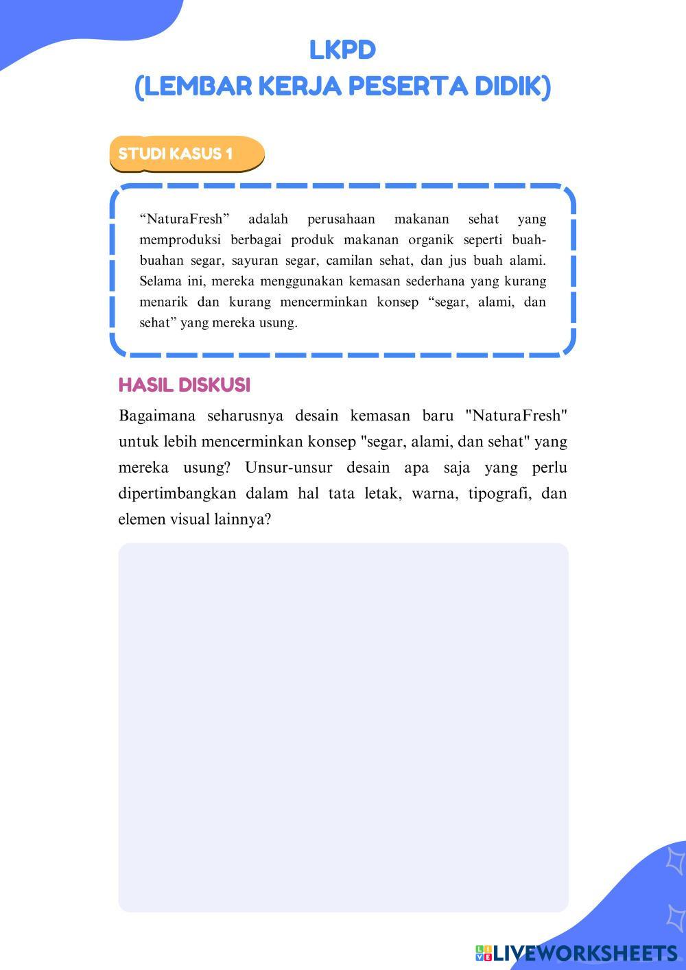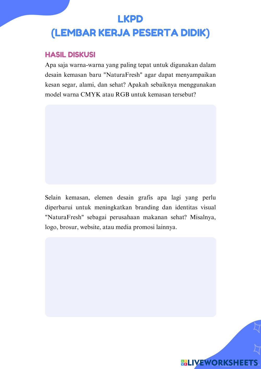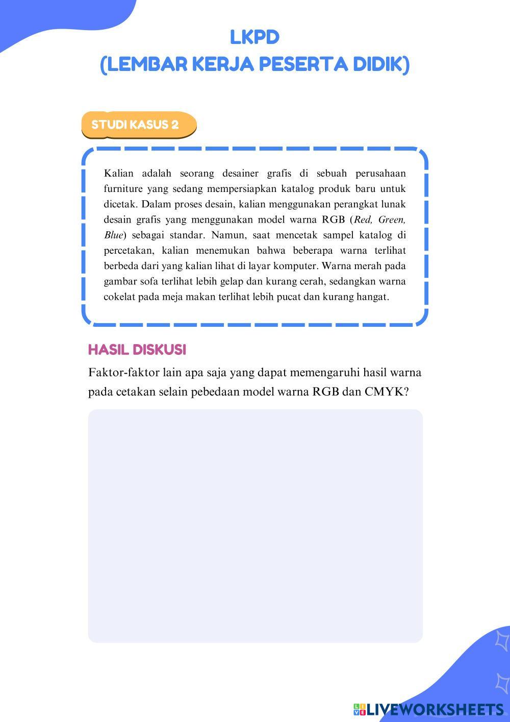 Created byAcha Fatimatuz Zahra SMKN 6 MALANG Dasar Desain Grafis Age 15+ level: SMK Indonesian Author's Instructions My Google Classroom Courses × 0 classes selected (0 students total) Quick Access Select all classes (0 classes) All Classes Loading courses... Cancel Share Share to selected Course __COURSE_NAME__ __STUDENT_NAME__ (__STUDENT_EMAIL__) LKPD Desain Grafis Download Worksheet Validation Check my answers Emails my answers to my teacher Full name Group/level School subject Teacher's email or key code Close Submit Validating worksheet... (12) Your answers have been sent to your teacher. Good luck! OK We encountered an error submitting your answers. Please try again. OK Advertisement | Go Ad Free Created byAcha Fatimatuz Zahra SMKN 6 MALANG Dasar Desain Grafis Age 15+ level: SMK Indonesian Author's Instructions