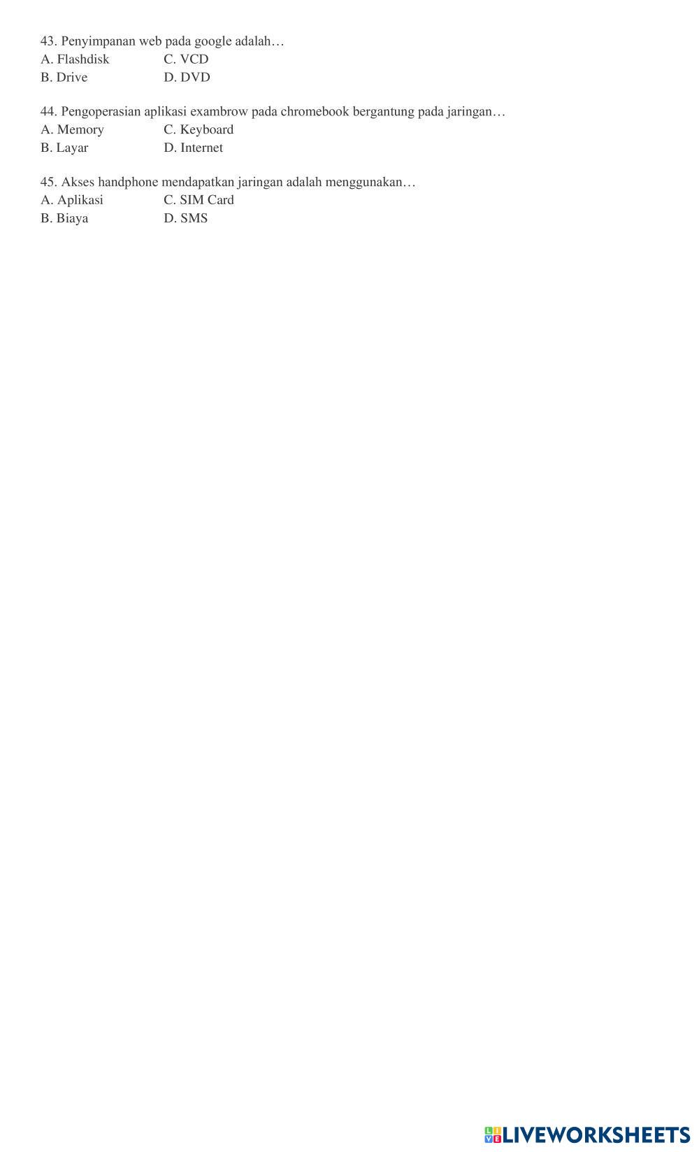 Created byMechael. S.Pd SMP Informatika Age 12-17 level: D Indonesian Author's Instructions SUMATIF My Google Classroom Courses × 0 classes selected (0 students total) Quick Access Select all classes (0 classes) All Classes Loading courses... Cancel Share Share to selected Course __COURSE_NAME__ __STUDENT_NAME__ (__STUDENT_EMAIL__) INFORMATIKA 7 Download Worksheet Validation Check my answers Emails my answers to my teacher Full name Group/level School subject Teacher's email or key code Close Submit Validating worksheet... (12) Your answers have been sent to your teacher. Good luck! OK We encountered an error submitting your answers. Please try again. OK Advertisement | Go Ad Free Created byMechael. S.Pd SMP Informatika Age 12-17 level: D Indonesian Author's Instructions SUMATIF