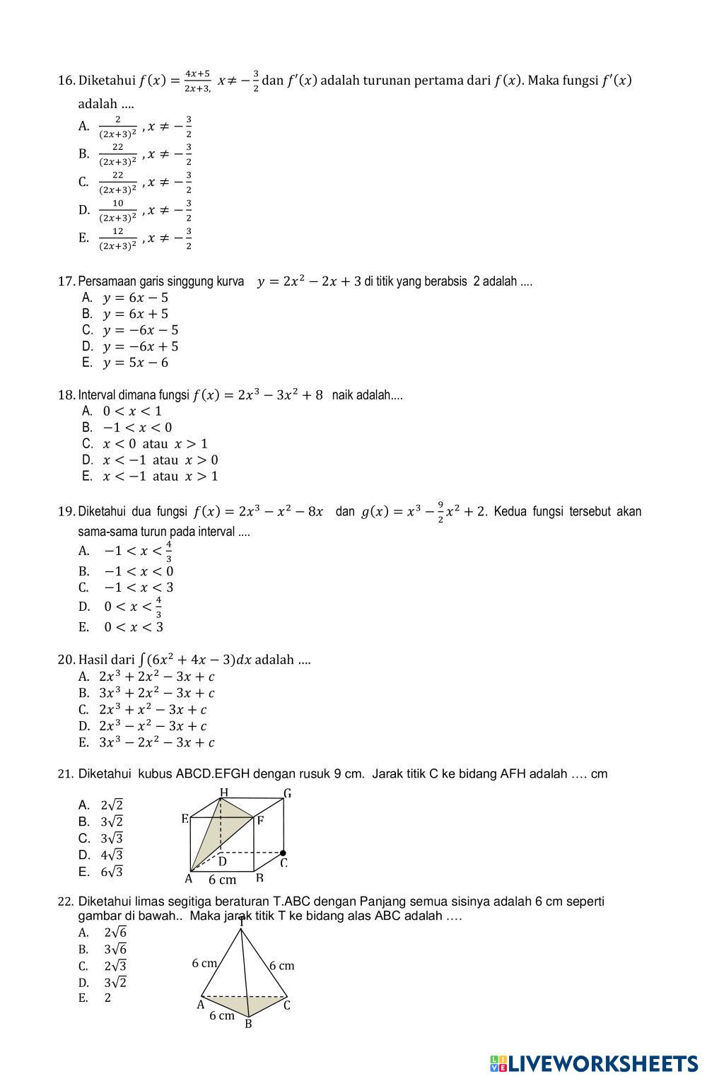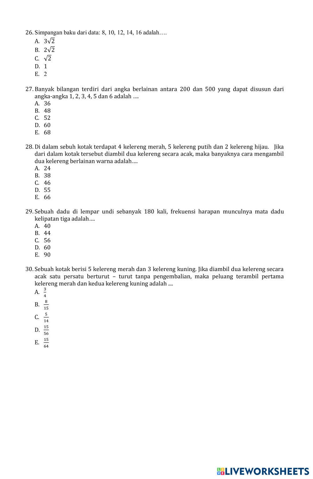 Created by titik_resmiati SOAL MTK UMUM US 24 MTK UMUM Age 16+ level: XII Indonesian Author's Instructions My Google Classroom Courses × 0 classes selected (0 students total) Quick Access Select all classes (0 classes) All Classes Loading courses... Cancel Share Share to selected Course __COURSE_NAME__ __STUDENT_NAME__ (__STUDENT_EMAIL__) SOAL MTK UMUM US 24 Download Worksheet Validation Check my answers Emails my answers to my teacher Full name Group/level School subject Teacher's email or key code Close Submit Validating worksheet... (12) Your answers have been sent to your teacher. Good luck! OK We encountered an error submitting your answers. Please try again. OK Advertisement | Go Ad Free Created by titik_resmiati SOAL MTK UMUM US 24 MTK UMUM Age 16+ level: XII Indonesian Author's Instructions
