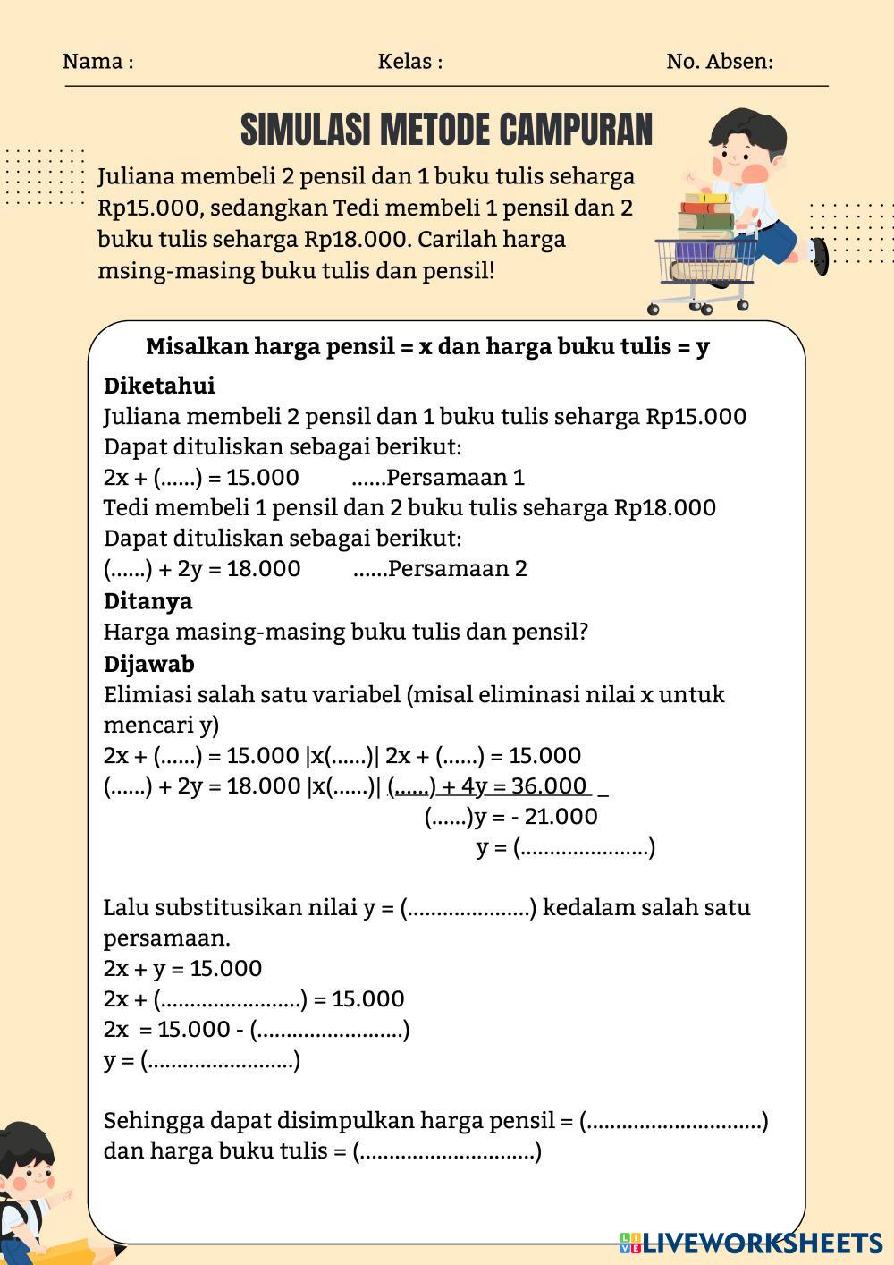 Created byDita Susi Evrihatin SPLDV Metode Campuran SPLDV Metode Campuran Age 14+ level: 9 Indonesian Author's Instructions Kerjakan dengan tepat! My Google Classroom Courses × 0 classes selected (0 students total) Quick Access Select all classes (0 classes) All Classes Loading courses... Cancel Share Share to selected Course __COURSE_NAME__ __STUDENT_NAME__ (__STUDENT_EMAIL__) SIMULASI METODE CAMPURAN Download Worksheet Validation Check my answers Emails my answers to my teacher Full name Group/level School subject Teacher's email or key code Close Submit Validating worksheet... (12) Your answers have been sent to your teacher. Good luck! OK We encountered an error submitting your answers. Please try again. OK Advertisement | Go Ad Free Created byDita Susi Evrihatin SPLDV Metode Campuran SPLDV Metode Campuran Age 14+ level: 9 Indonesian Author's Instructions Kerjakan dengan tepat!