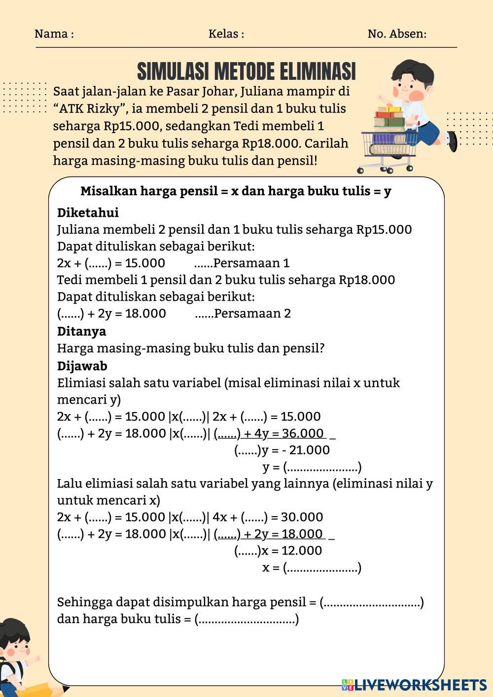 Created byDita Susi Evrihatin SPLDV Metode Eliminasi SPLDV Metode Eliminasi Age 12+ level: 8 Indonesian Author's Instructions Kerjakan simulasi dengan baik! My Google Classroom Courses × 0 classes selected (0 students total) Quick Access Select all classes (0 classes) All Classes Loading courses... Cancel Share Share to selected Course __COURSE_NAME__ __STUDENT_NAME__ (__STUDENT_EMAIL__) SIMULASI METODE ELIMINASI SPLDV Download Worksheet Validation Check my answers Emails my answers to my teacher Full name Group/level School subject Teacher's email or key code Close Submit Validating worksheet... (12) Your answers have been sent to your teacher. Good luck! OK We encountered an error submitting your answers. Please try again. OK Advertisement | Go Ad Free Created byDita Susi Evrihatin SPLDV Metode Eliminasi SPLDV Metode Eliminasi Age 12+ level: 8 Indonesian Author's Instructions Kerjakan simulasi dengan baik!