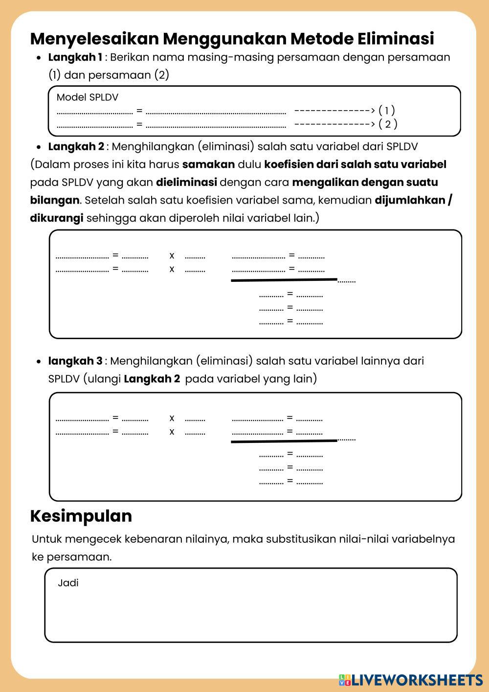 Created byNur Laili Isnainiyah SPLDV Spldv metode eliminasi dan subsitusi Age 13-18 level: 9 Indonesian Author's Instructions My Google Classroom Courses × 0 classes selected (0 students total) Quick Access Select all classes (0 classes) All Classes Loading courses... Cancel Share Share to selected Course __COURSE_NAME__ __STUDENT_NAME__ (__STUDENT_EMAIL__) E-LKPD SPLDV METODE ELIMINASI Download Worksheet Validation Check my answers Emails my answers to my teacher Full name Group/level School subject Teacher's email or key code Close Submit Validating worksheet... (12) Your answers have been sent to your teacher. Good luck! OK We encountered an error submitting your answers. Please try again. OK Advertisement | Go Ad Free Created byNur Laili Isnainiyah SPLDV Spldv metode eliminasi dan subsitusi Age 13-18 level: 9 Indonesian Author's Instructions
