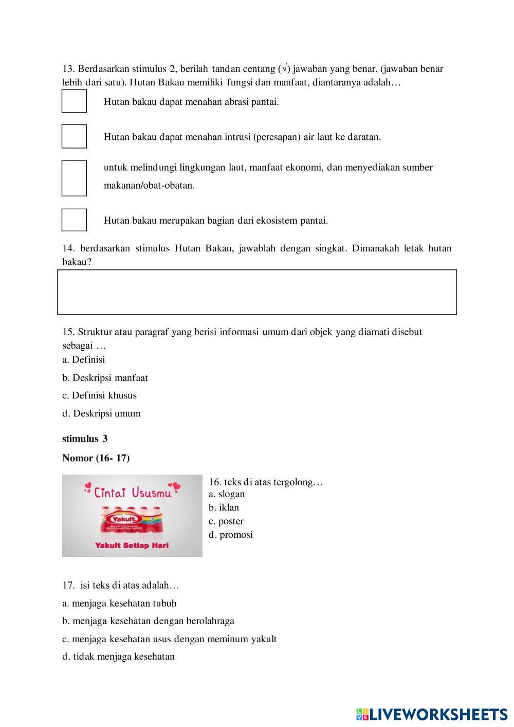 Created byAgata Octavianti Renita STS BAHASA INDONESIA GANJIL STS BAHASA INDONESIA GANJIL Age 13-11 level: 8 Indonesian Author's Instructions STS BAHASA INDONESIA GANJIL KELAS 8 My Google Classroom Courses × 0 classes selected (0 students total) Quick Access Select all classes (0 classes) All Classes Loading courses... Cancel Share Share to selected Course __COURSE_NAME__ __STUDENT_NAME__ (__STUDENT_EMAIL__) STS BAHASA INDONESIA GANJIL Download Worksheet Validation Check my answers Emails my answers to my teacher Full name Group/level School subject Teacher's email or key code Close Submit Validating worksheet... (12) Your answers have been sent to your teacher. Good luck! OK We encountered an error submitting your answers. Please try again. OK Advertisement | Go Ad Free Created byAgata Octavianti Renita STS BAHASA INDONESIA GANJIL STS BAHASA INDONESIA GANJIL Age 13-11 level: 8 Indonesian Author's Instructions STS BAHASA INDONESIA GANJIL KELAS 8