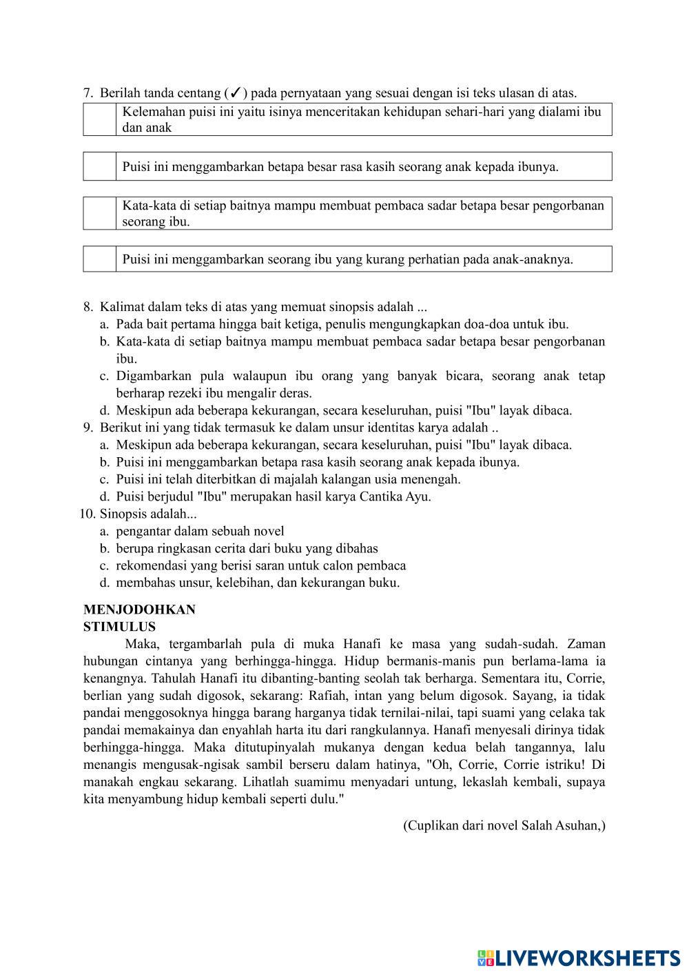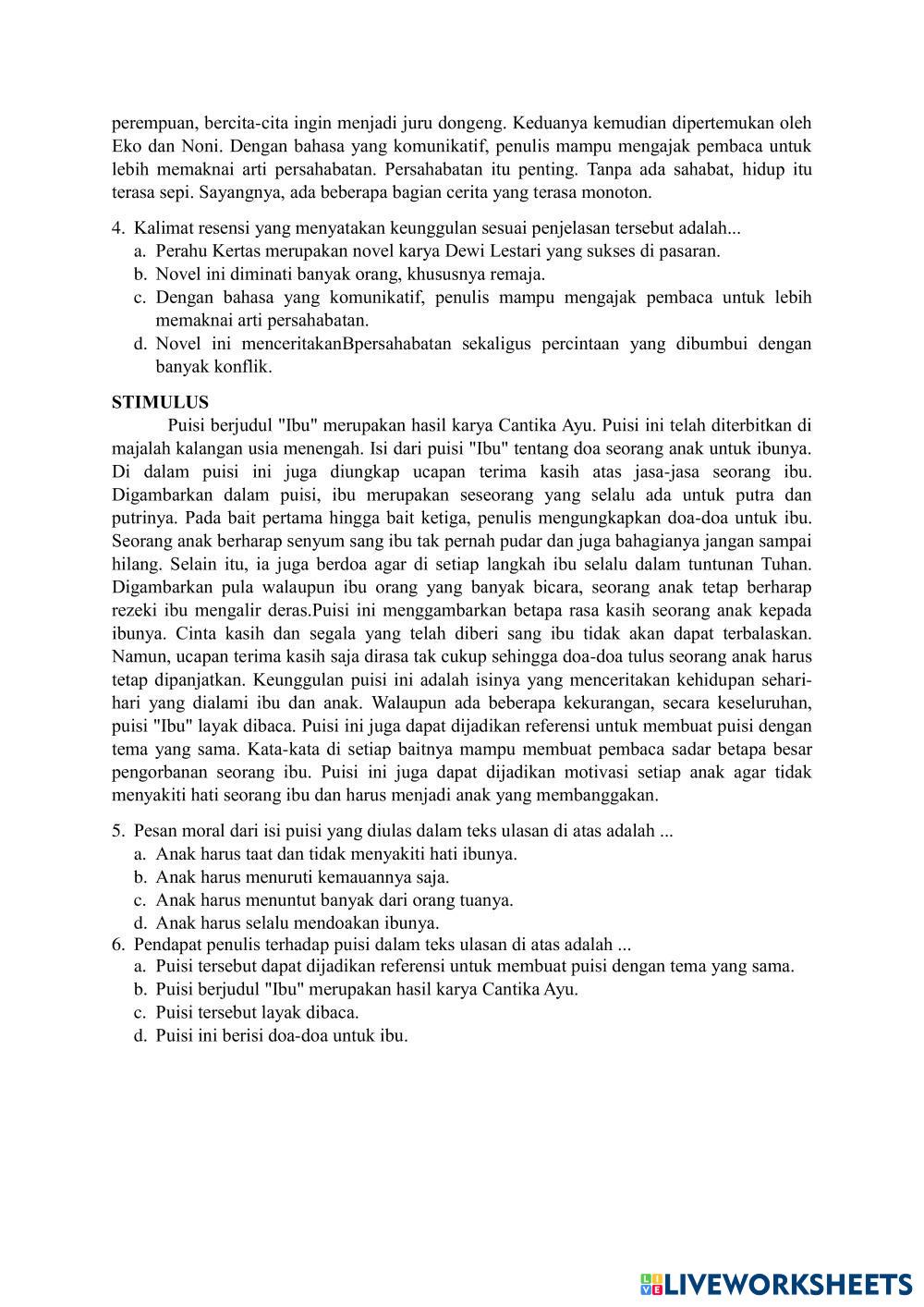 Created byAgata Octavianti Renita STS BAHASA INDONESIA KELAS 8 STS KELAS 8 BAHASA INDONESIA Age 14-18 level: 8 Indonesian Author's Instructions SUMATIF TENGAH SEMESTER GENAP KELAS 8 BAHASA INDONESIA My Google Classroom Courses × 0 classes selected (0 students total) Quick Access Select all classes (0 classes) All Classes Loading courses... Cancel Share Share to selected Course __COURSE_NAME__ __STUDENT_NAME__ (__STUDENT_EMAIL__) STS BAHASA INDONESIA Download Worksheet Validation Check my answers Emails my answers to my teacher Full name Group/level School subject Teacher's email or key code Close Submit Validating worksheet... (12) Your answers have been sent to your teacher. Good luck! OK We encountered an error submitting your answers. Please try again. OK Advertisement | Go Ad Free Created byAgata Octavianti Renita STS BAHASA INDONESIA KELAS 8 STS KELAS 8 BAHASA INDONESIA Age 14-18 level: 8 Indonesian Author's Instructions SUMATIF TENGAH SEMESTER GENAP KELAS 8 BAHASA INDONESIA