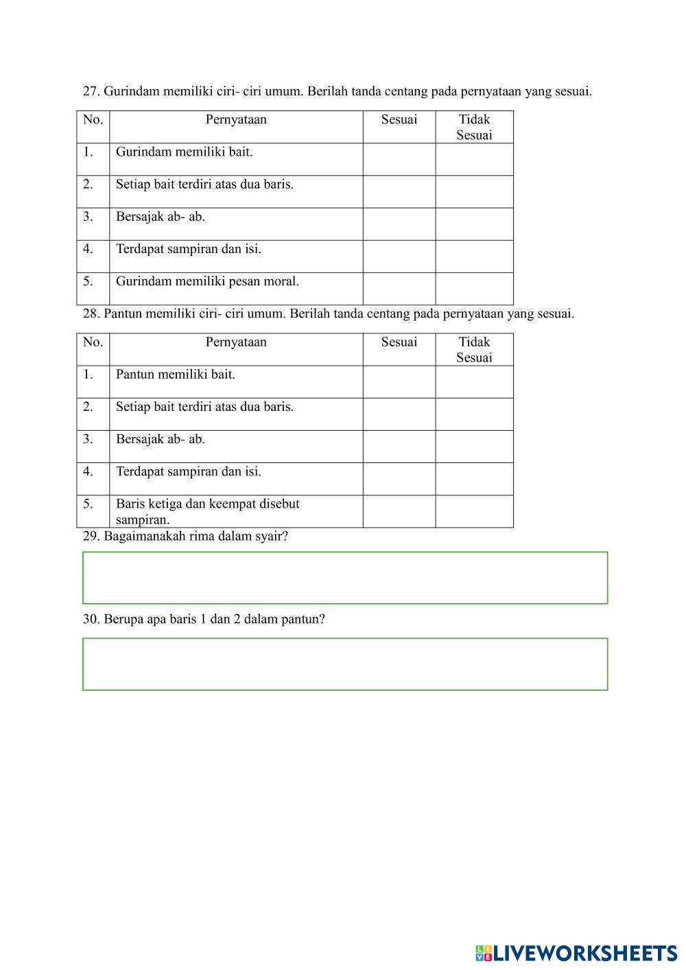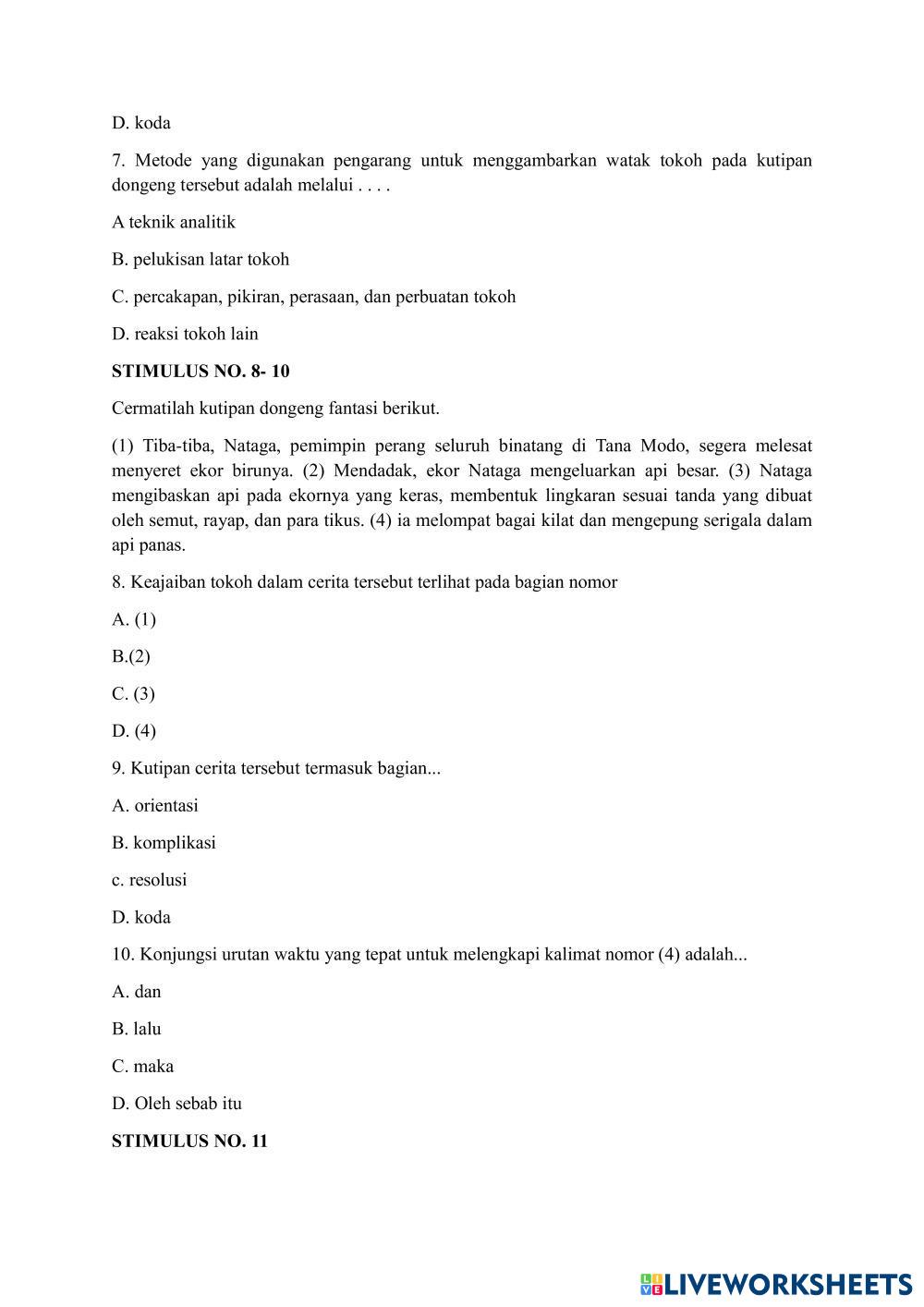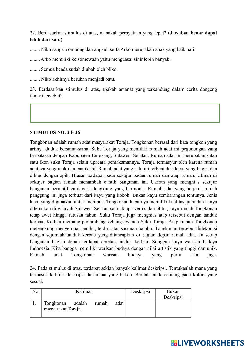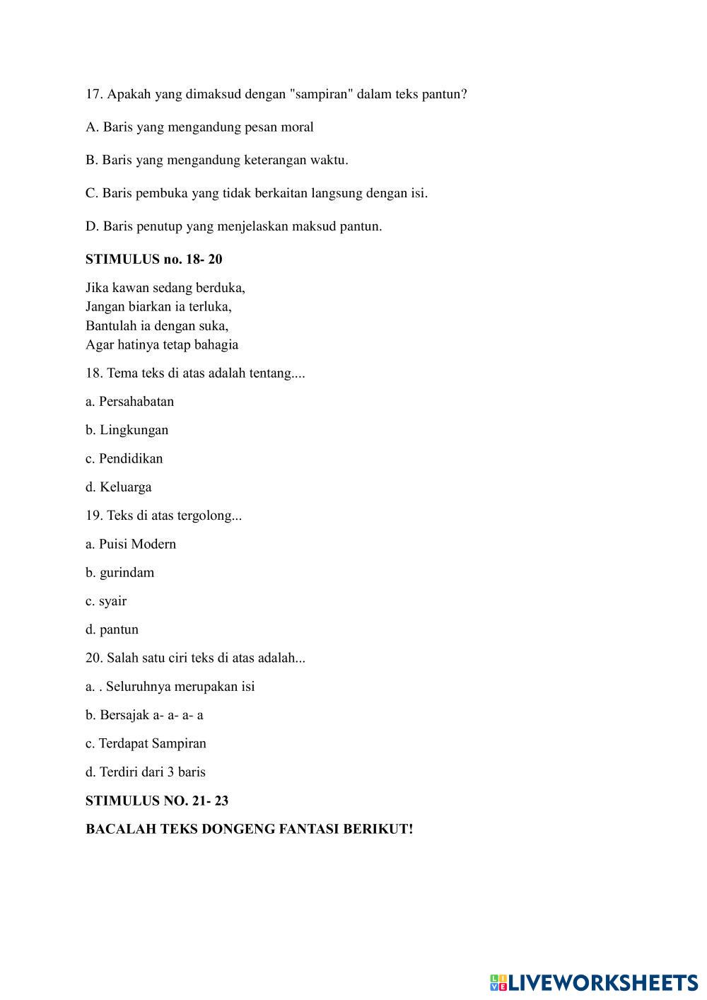 Created byAgata Octavianti Renita STS GANJIL BAHASA INDONESIA KELAS 7 STS GANJIL BAHASA INDONESIA KELAS 7 Age 14+ level: 7 Indonesian Author's Instructions STS GANJIL BAHASA INDONESIA KELAS 7 T.A 2024- 2025 My Google Classroom Courses × 0 classes selected (0 students total) Quick Access Select all classes (0 classes) All Classes Loading courses... Cancel Share Share to selected Course __COURSE_NAME__ __STUDENT_NAME__ (__STUDENT_EMAIL__) STS BAHASA INDONESIA GANJIL Download Worksheet Validation Check my answers Emails my answers to my teacher Full name Group/level School subject Teacher's email or key code Close Submit Validating worksheet... (12) Your answers have been sent to your teacher. Good luck! OK We encountered an error submitting your answers. Please try again. OK Advertisement | Go Ad Free Created byAgata Octavianti Renita STS GANJIL BAHASA INDONESIA KELAS 7 STS GANJIL BAHASA INDONESIA KELAS 7 Age 14+ level: 7 Indonesian Author's Instructions STS GANJIL BAHASA INDONESIA KELAS 7 T.A 2024- 2025