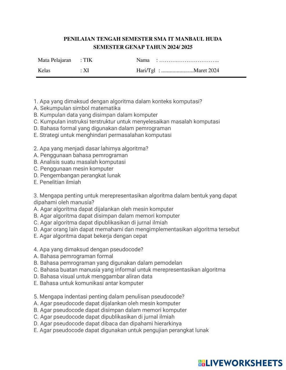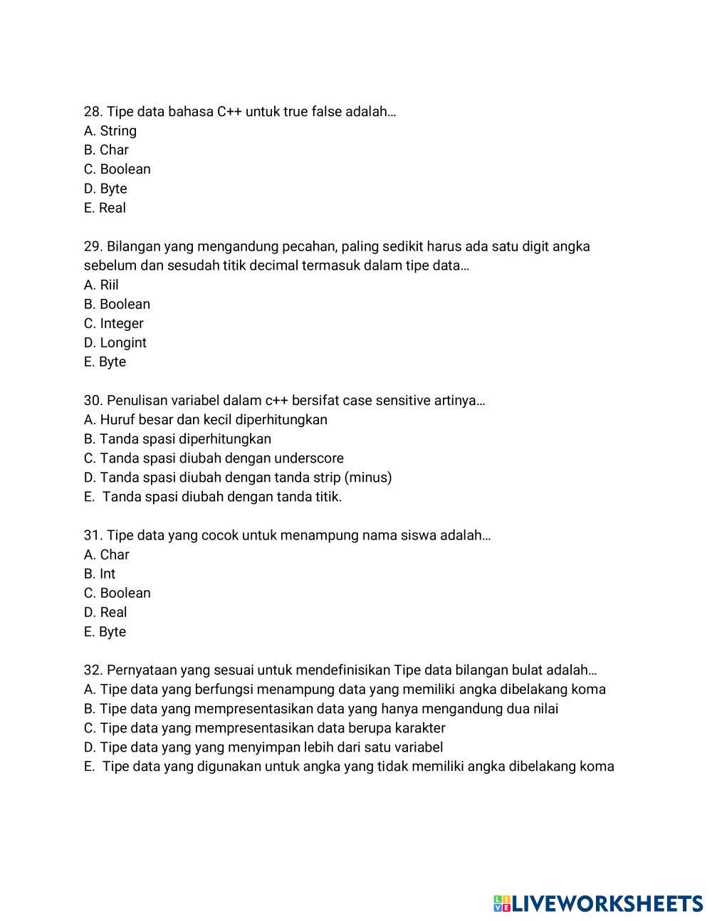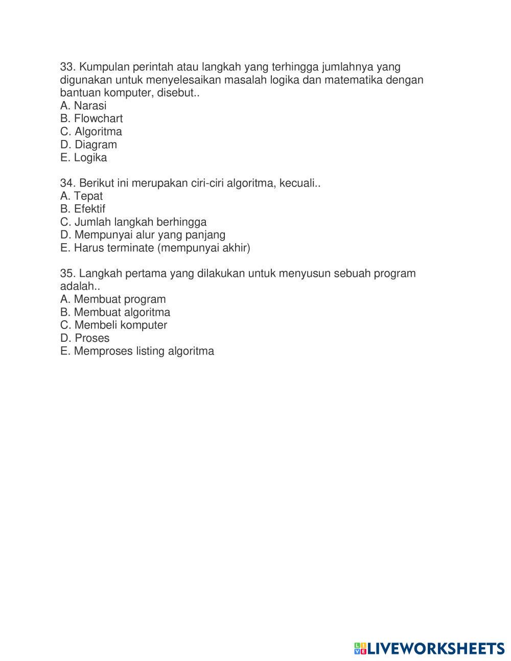Created bysmaitmanbaulhuda TIK Tik Age 12+ level: SMA Indonesian Author's Instructions My Google Classroom Courses × 0 classes selected (0 students total) Quick Access Select all classes (0 classes) All Classes Loading courses... Cancel Share Share to selected Course __COURSE_NAME__ __STUDENT_NAME__ (__STUDENT_EMAIL__) PTS-TIK-11 Download Worksheet Validation Check my answers Emails my answers to my teacher Full name Group/level School subject Teacher's email or key code Close Submit Validating worksheet... (12) Your answers have been sent to your teacher. Good luck! OK We encountered an error submitting your answers. Please try again. OK Advertisement | Go Ad Free Created bysmaitmanbaulhuda TIK Tik Age 12+ level: SMA Indonesian Author's Instructions