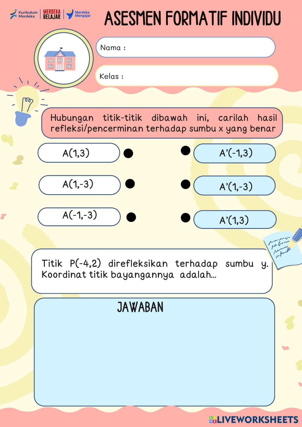 Created byMaratus Syakdia transformasi geometri Translasi dan Refleksi Age 16+ level: 12 Indonesian Author's Instructions My Google Classroom Courses × 0 classes selected (0 students total) Quick Access Select all classes (0 classes) All Classes Loading courses... Cancel Share Share to selected Course __COURSE_NAME__ __STUDENT_NAME__ (__STUDENT_EMAIL__) Refleksi Pada Titik Download Worksheet Validation Check my answers Emails my answers to my teacher Full name Group/level School subject Teacher's email or key code Close Submit Validating worksheet... (12) Your answers have been sent to your teacher. Good luck! OK We encountered an error submitting your answers. Please try again. OK Advertisement | Go Ad Free Created byMaratus Syakdia transformasi geometri Translasi dan Refleksi Age 16+ level: 12 Indonesian Author's Instructions