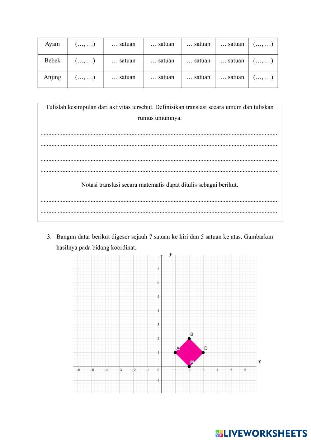 Created byZul Karnadi transformasi geometri Translasi Age 14+ level: 9 Indonesian Author's Instructions My Google Classroom Courses × 0 classes selected (0 students total) Quick Access Select all classes (0 classes) All Classes Loading courses... Cancel Share Share to selected Course __COURSE_NAME__ __STUDENT_NAME__ (__STUDENT_EMAIL__) Trasnlasi Download Worksheet Validation Check my answers Emails my answers to my teacher Full name Group/level School subject Teacher's email or key code Close Submit Validating worksheet... (12) Your answers have been sent to your teacher. Good luck! OK We encountered an error submitting your answers. Please try again. OK Advertisement | Go Ad Free Created byZul Karnadi transformasi geometri Translasi Age 14+ level: 9 Indonesian Author's Instructions