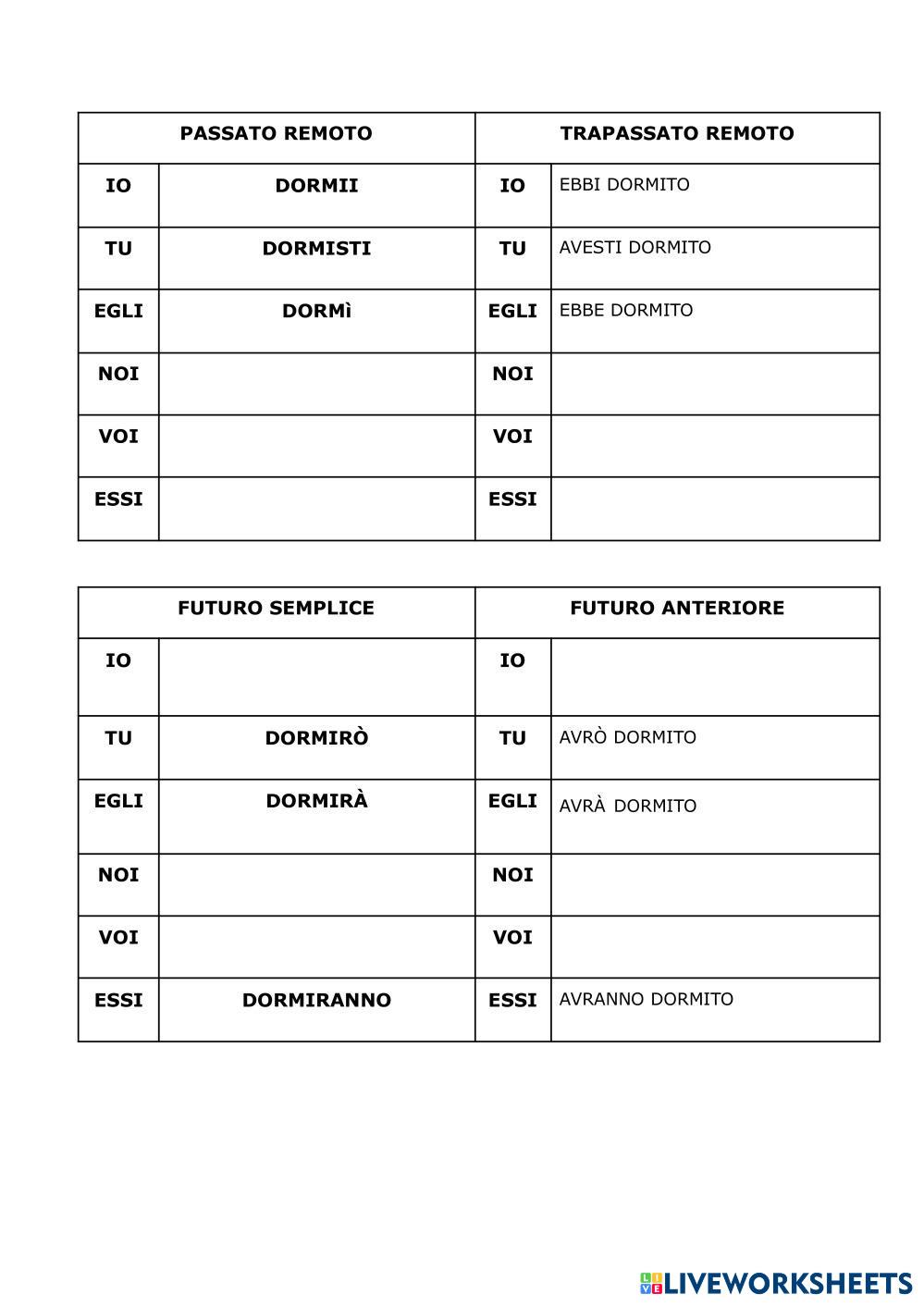 Scegli l'opzione corretta per coniugare il verbo DORMIRE.