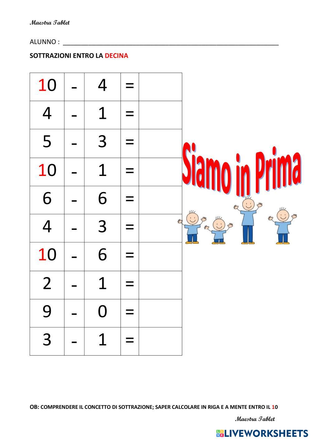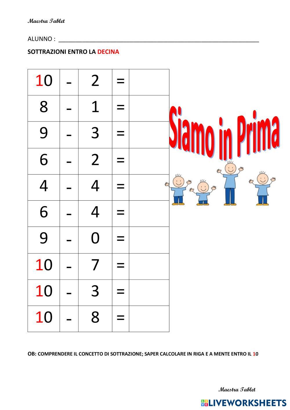 Created by MaestraTablet Math Elementary 1st grade Addition and Subtraction Italian Author's Instructions ESEGUI LE SOTTRAZIONI My Google Classroom Courses × 0 classes selected (0 students total) Quick Access Select all classes (0 classes) All Classes Loading courses... Cancel Share Share to selected Course __COURSE_NAME__ __STUDENT_NAME__ (__STUDENT_EMAIL__) SOTTRAZIONI ENTRO IL 10 Download Worksheet Validation Check my answers Emails my answers to my teacher Full name Group/level School subject Teacher's email or key code Close Submit Validating worksheet... (12) Your answers have been sent to your teacher. Good luck! OK We encountered an error submitting your answers. Please try again. OK Advertisement | Go Ad Free Created by MaestraTablet Math Elementary 1st grade Addition and Subtraction Italian Author's Instructions ESEGUI LE SOTTRAZIONI Explore Worksheets L2V2 Math 1st grade L2V2 Addition and Subtraction - Math do L1V2 Math 1st grade L1V2 Addition and Subtraction - Math do جمع العشرات Math 1st grade جمع العشرات Addition and Subtraction - Math اجمع Sumas y restas. Math 1st grade Sumas y restas. Addition and Subtraction - Math Realiza las operaciones.