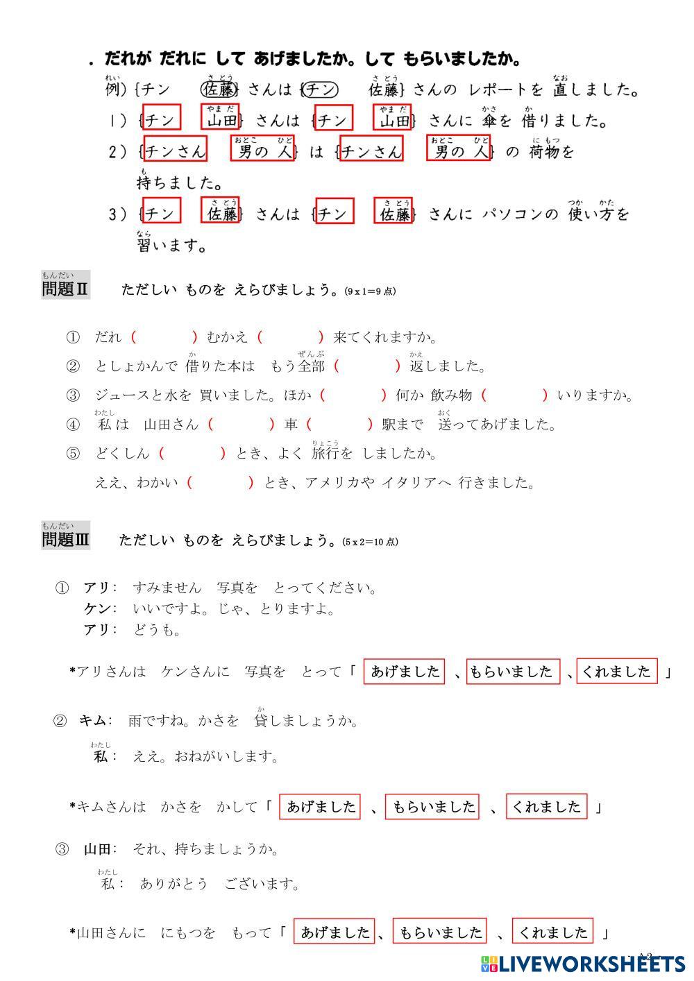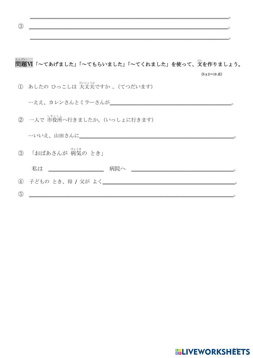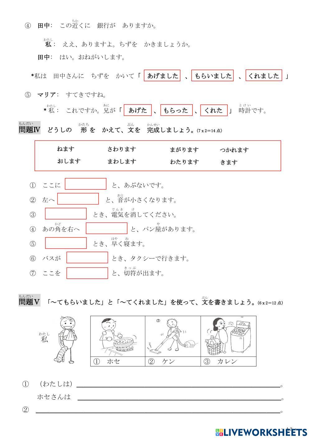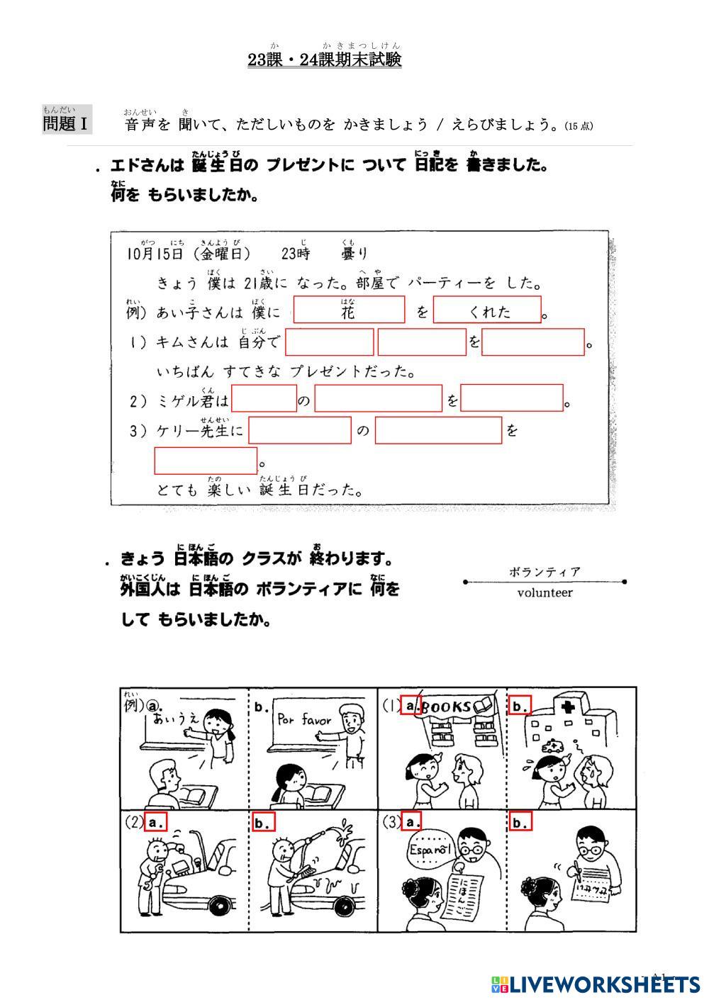 Created by Jsensei ESL Japanese A2 Grammar Japanese Author's Instructions ・ My Google Classroom Courses × 0 classes selected (0 students total) Quick Access Select all classes (0 classes) All Classes Loading courses... Cancel Share Share to selected Course __COURSE_NAME__ __STUDENT_NAME__ (__STUDENT_EMAIL__) 23課-24課期末試験 Download Worksheet Validation Check my answers Emails my answers to my teacher Full name Group/level School subject Teacher's email or key code Close Submit Validating worksheet... (12) Your answers have been sent to your teacher. Good luck! OK We encountered an error submitting your answers. Please try again. OK Advertisement | Go Ad Free Created by Jsensei ESL Japanese A2 Grammar Japanese Author's Instructions ・ Explore Worksheets 〜るようになる/〜なくなる ESL A2 〜るようになる/〜なくなる Grammar - ESL ( )の言葉を__に適当な形で書いてください。 Sonkeigo ESL A2 Sonkeigo Grammar - ESL Kerjakan dengan baik ! 〜ろうです/〜てから・〜るまで ESL A2 〜ろうです/〜てから・〜るまで Grammar - ESL よく読んで、正しいことばを選んでください。 〜てから/〜るまで ESL A2 〜てから/〜るまで Grammar - ESL イラストを見て、正しい答えを選んでください。