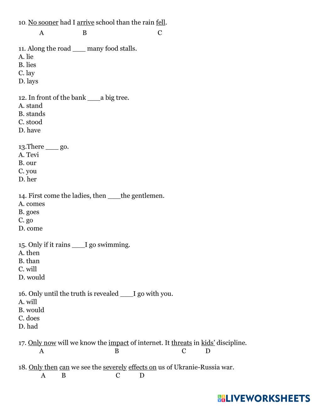 Created by kongrady English as a Second Language GRAMMAR Age 18-16 level: 6 Khmer Author's Instructions My Google Classroom Courses × 0 classes selected (0 students total) Quick Access Select all classes (0 classes) All Classes Loading courses... Cancel Share Share to selected Course __COURSE_NAME__ __STUDENT_NAME__ (__STUDENT_EMAIL__) TOEFL GRAMMAR REVISION TEST 13 Download Worksheet Validation Check my answers Emails my answers to my teacher Full name Group/level School subject Teacher's email or key code Close Submit Validating worksheet... (12) Your answers have been sent to your teacher. Good luck! OK We encountered an error submitting your answers. Please try again. OK Advertisement | Go Ad Free Created by kongrady English as a Second Language GRAMMAR Age 18-16 level: 6 Khmer Author's Instructions