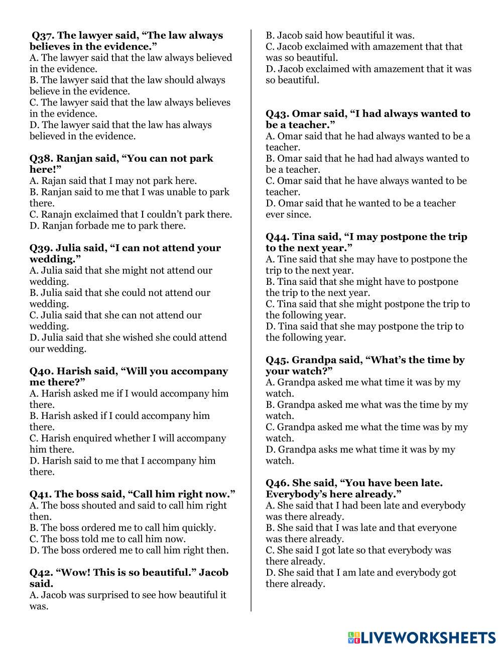 Created by kongrady English as a Second Language GRAMMAR Age 18-16 level: 6 Khmer Author's Instructions My Google Classroom Courses × 0 classes selected (0 students total) Quick Access Select all classes (0 classes) All Classes Loading courses... Cancel Share Share to selected Course __COURSE_NAME__ __STUDENT_NAME__ (__STUDENT_EMAIL__) Reported Speech Quiz 19 Download Worksheet Validation Check my answers Emails my answers to my teacher Full name Group/level School subject Teacher's email or key code Close Submit Validating worksheet... (12) Your answers have been sent to your teacher. Good luck! OK We encountered an error submitting your answers. Please try again. OK Advertisement | Go Ad Free Created by kongrady English as a Second Language GRAMMAR Age 18-16 level: 6 Khmer Author's Instructions