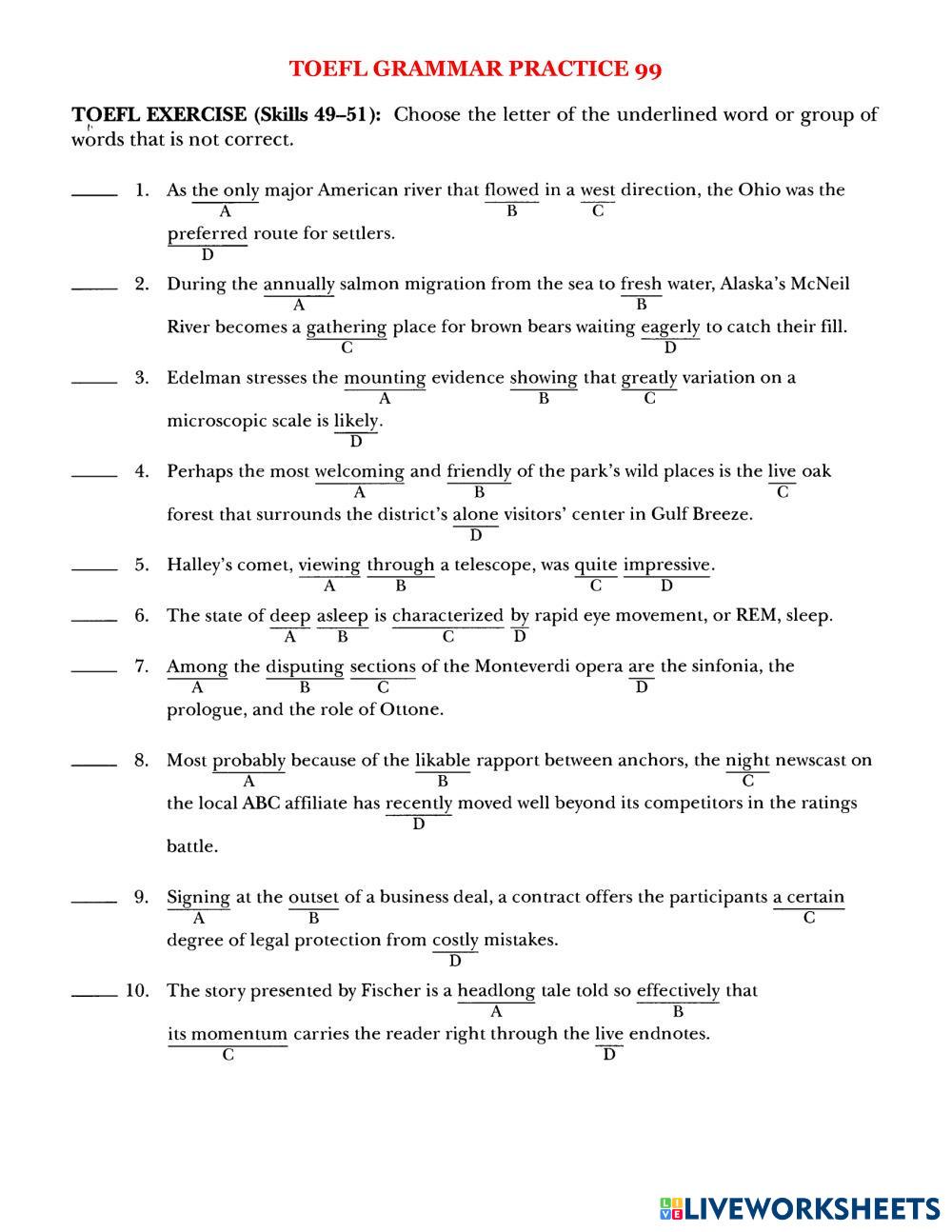 Created by kongrady English Grammar Age 17+ level: 6 Khmer Author's Instructions My Google Classroom Courses × 0 classes selected (0 students total) Quick Access Select all classes (0 classes) All Classes Loading courses... Cancel Share Share to selected Course __COURSE_NAME__ __STUDENT_NAME__ (__STUDENT_EMAIL__) TOEFL GRAMMAR PRACTICE 99 Download Worksheet Validation Check my answers Emails my answers to my teacher Full name Group/level School subject Teacher's email or key code Close Submit Validating worksheet... (12) Your answers have been sent to your teacher. Good luck! OK We encountered an error submitting your answers. Please try again. OK Advertisement | Go Ad Free Created by kongrady English Grammar Age 17+ level: 6 Khmer Author's Instructions
