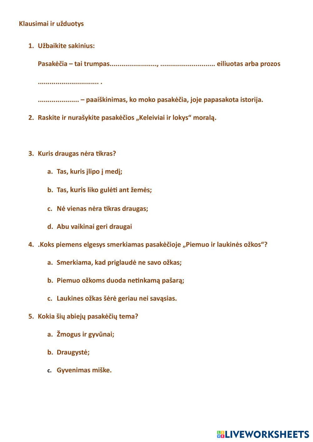 Created byMigle Lietuvių kalba ir literatūra Pasakėčios Age 11-15 level: 5 Lithuanian Author's Instructions Pasakėčios My Google Classroom Courses × 0 classes selected (0 students total) Quick Access Select all classes (0 classes) All Classes Loading courses... Cancel Share Share to selected Course __COURSE_NAME__ __STUDENT_NAME__ (__STUDENT_EMAIL__) Pasakėčios Download Worksheet Validation Check my answers Emails my answers to my teacher Full name Group/level School subject Teacher's email or key code Close Submit Validating worksheet... (12) Your answers have been sent to your teacher. Good luck! OK We encountered an error submitting your answers. Please try again. OK Advertisement | Go Ad Free Created byMigle Lietuvių kalba ir literatūra Pasakėčios Age 11-15 level: 5 Lithuanian Author's Instructions Pasakėčios