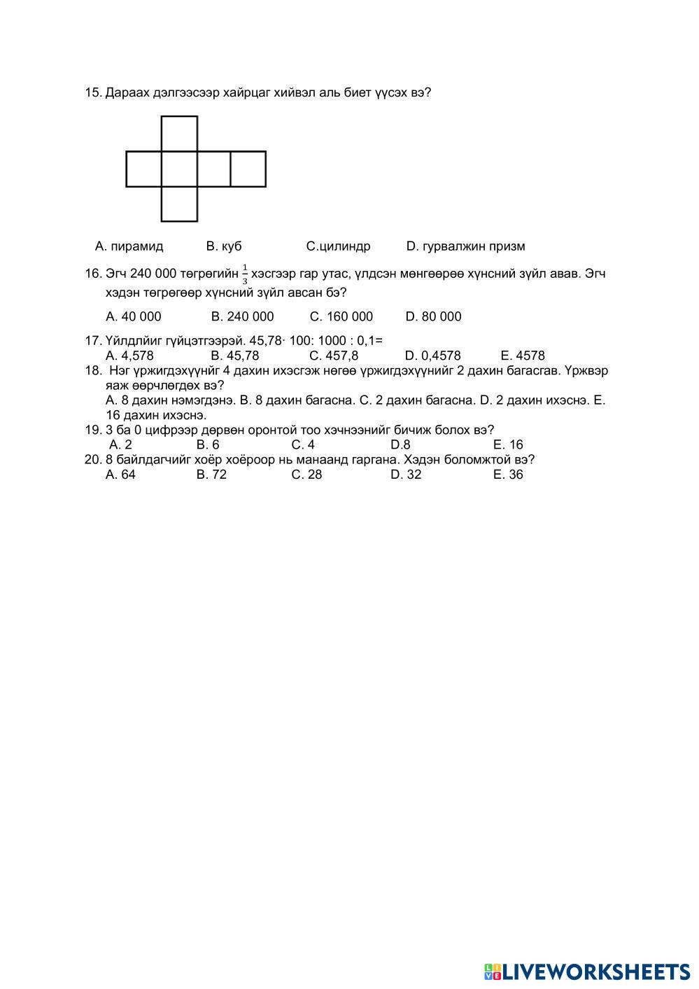 Created bybadamnyam Math Elementary 5th grade Addition and Subtraction Mongolian Author's Instructions 5-р анги My Google Classroom Courses × 0 classes selected (0 students total) Quick Access Select all classes (0 classes) All Classes Loading courses... Cancel Share Share to selected Course __COURSE_NAME__ __STUDENT_NAME__ (__STUDENT_EMAIL__) Математикийн аварга анги-5 Download Worksheet Validation Check my answers Emails my answers to my teacher Full name Group/level School subject Teacher's email or key code Close Submit Validating worksheet... (12) Your answers have been sent to your teacher. Good luck! OK We encountered an error submitting your answers. Please try again. OK Advertisement | Go Ad Free Created bybadamnyam Math Elementary 5th grade Addition and Subtraction Mongolian Author's Instructions 5-р анги Explore Worksheets ايجاد قيمة التعابير Math 5th grade ايجاد قيمة التعابير Addition and Subtraction - Math يستبدل الطالب المتغير بعدد ويوجد قيمة التعبير ضرب الاعدلد العشرية Math 5th grade ضرب الاعدلد العشرية Addition and Subtraction - Math احب عن الاسئلة التعبير E Math 5th grade التعبير E Addition and Subtraction - Math حل مسائل التعبير E Math 5th grade التعبير E Addition and Subtraction - Math التعبير