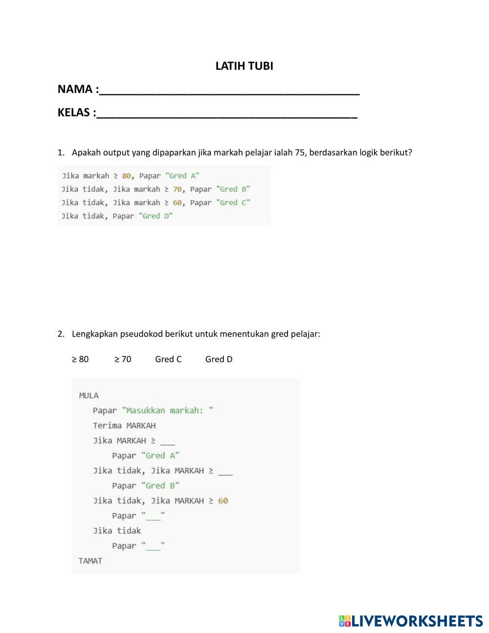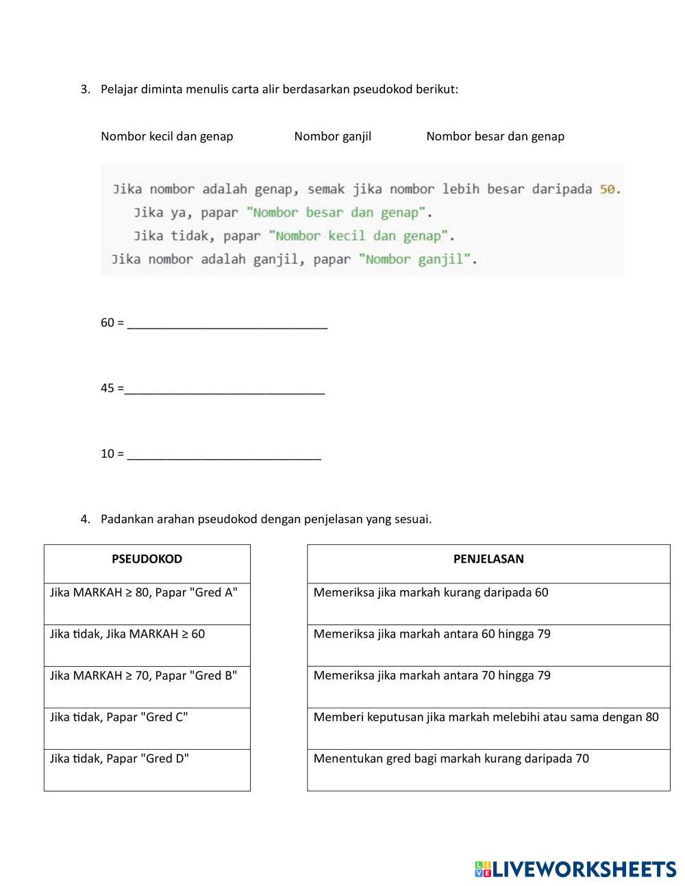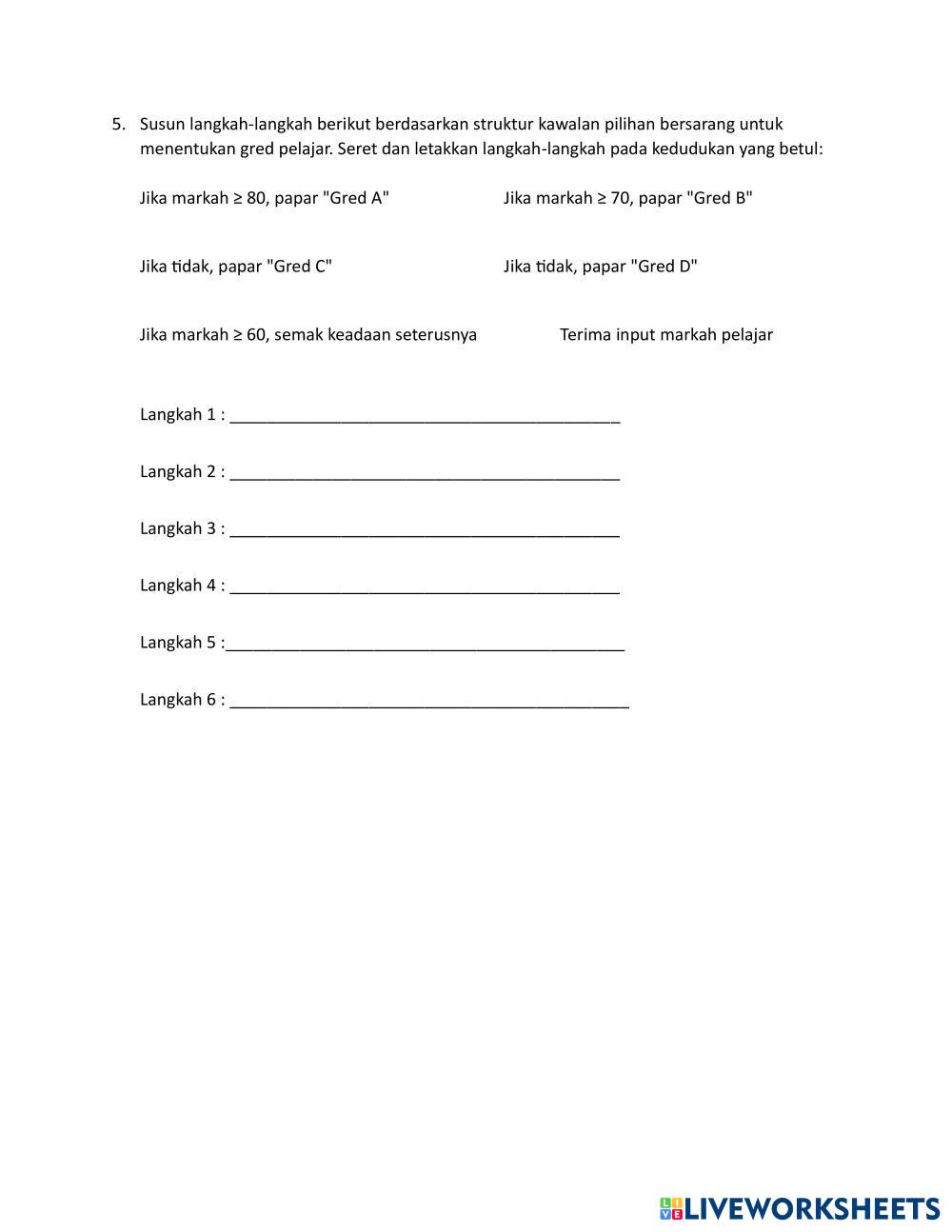 Created byMIERAEZ Asas Sains Komputer Tingkatan 2 Pembangunan Algoritma Age 13-18 level: TINGKATAN 2 Malay Author's Instructions My Google Classroom Courses × 0 classes selected (0 students total) Quick Access Select all classes (0 classes) All Classes Loading courses... Cancel Share Share to selected Course __COURSE_NAME__ __STUDENT_NAME__ (__STUDENT_EMAIL__) LATIH TUBI 2.1.1 Download Worksheet Validation Check my answers Emails my answers to my teacher Full name Group/level School subject Teacher's email or key code Close Submit Validating worksheet... (12) Your answers have been sent to your teacher. Good luck! OK We encountered an error submitting your answers. Please try again. OK Advertisement | Go Ad Free Created byMIERAEZ Asas Sains Komputer Tingkatan 2 Pembangunan Algoritma Age 13-18 level: TINGKATAN 2 Malay Author's Instructions