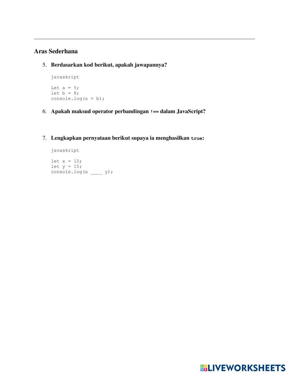 Created byNur Ayuni Asas Sains Komputer Tingkatan 2 Jawab semua soalan Age 14+ level: TINGKATAN 2 Malay Author's Instructions My Google Classroom Courses × 0 classes selected (0 students total) Quick Access Select all classes (0 classes) All Classes Loading courses... Cancel Share Share to selected Course __COURSE_NAME__ __STUDENT_NAME__ (__STUDENT_EMAIL__) OPERATOR PERBANDINGAN Download Worksheet Validation Check my answers Emails my answers to my teacher Full name Group/level School subject Teacher's email or key code Close Submit Validating worksheet... (12) Your answers have been sent to your teacher. Good luck! OK We encountered an error submitting your answers. Please try again. OK Advertisement | Go Ad Free Created byNur Ayuni Asas Sains Komputer Tingkatan 2 Jawab semua soalan Age 14+ level: TINGKATAN 2 Malay Author's Instructions