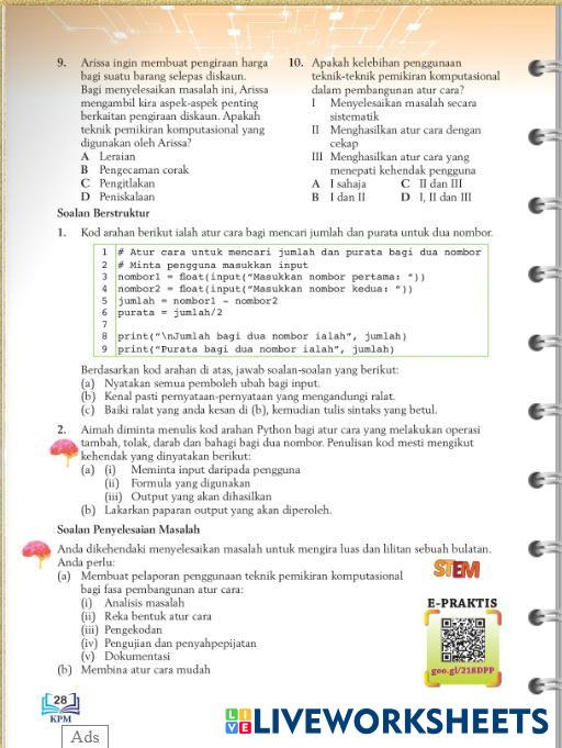 Created byMOHAMAD RASHID BIN MOHD ROSLI Asas Sains Komputer Tingkatan 3 pelaporan Age 13-18 level: Tingkatan 3 Malay Author's Instructions My Google Classroom Courses × 0 classes selected (0 students total) Quick Access Select all classes (0 classes) All Classes Loading courses... Cancel Share Share to selected Course __COURSE_NAME__ __STUDENT_NAME__ (__STUDENT_EMAIL__) Pelaporan Teknik Pemikiran Komputasional Download Worksheet Validation Check my answers Emails my answers to my teacher Full name Group/level School subject Teacher's email or key code Close Submit Validating worksheet... (12) Your answers have been sent to your teacher. Good luck! OK We encountered an error submitting your answers. Please try again. OK Advertisement | Go Ad Free Created byMOHAMAD RASHID BIN MOHD ROSLI Asas Sains Komputer Tingkatan 3 pelaporan Age 13-18 level: Tingkatan 3 Malay Author's Instructions