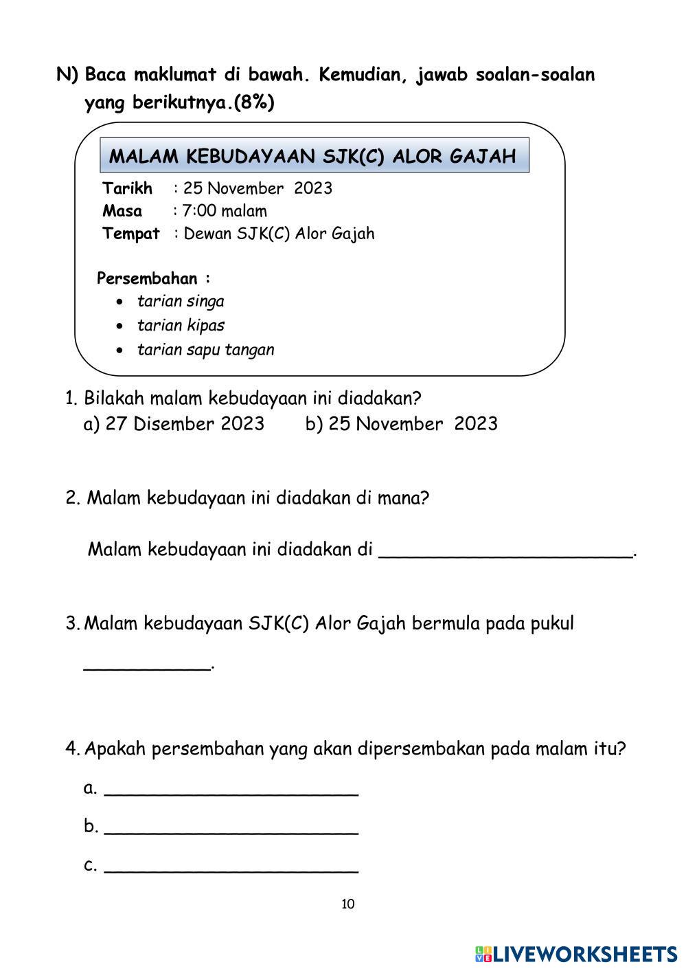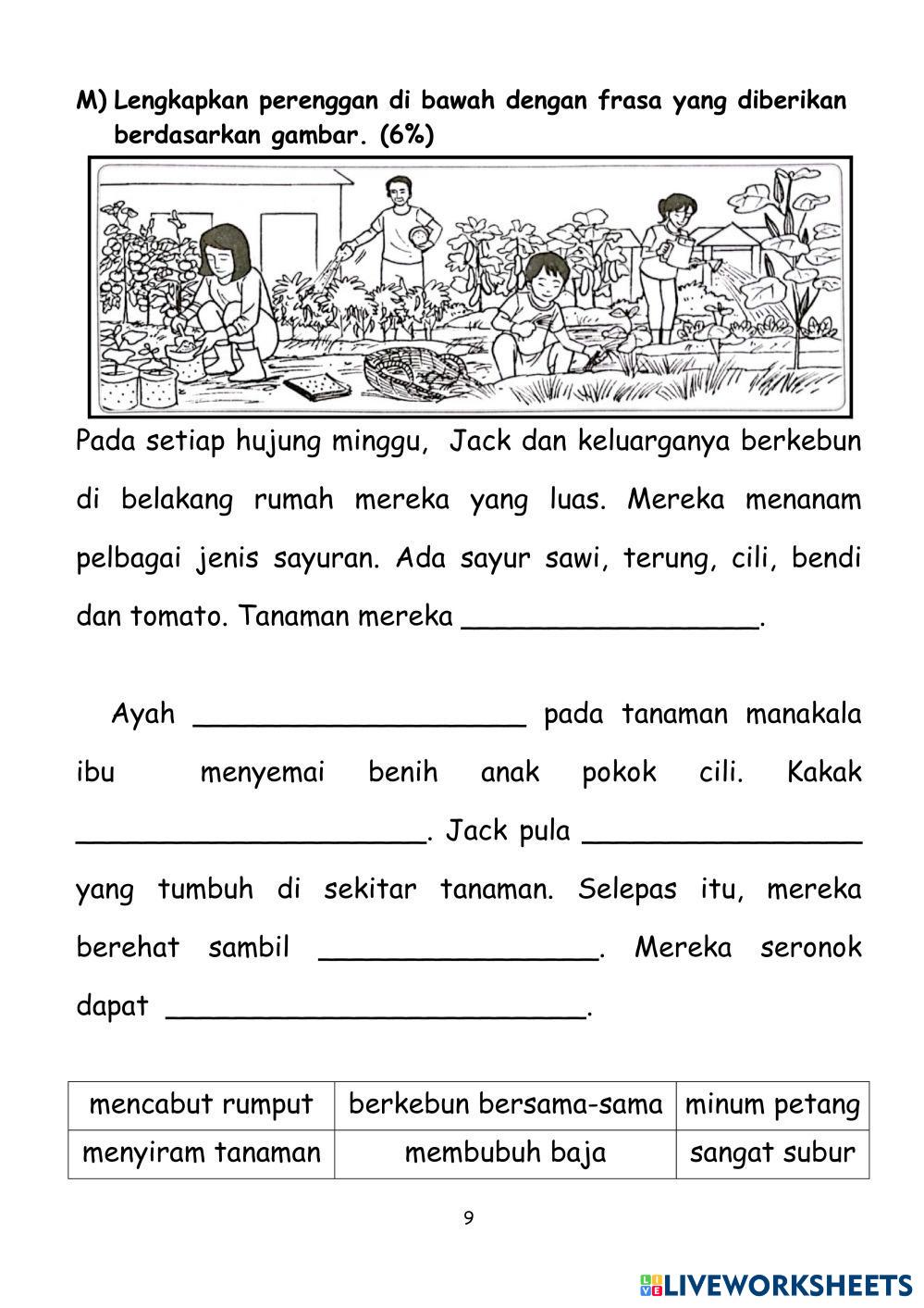 Created by Kairie Bahasa Melayu (BM) Bahasa Melayu Age 7-15 level: 3 Malay Author's Instructions PENTAKSIRAN BM TAHUN 3 My Google Classroom Courses × 0 classes selected (0 students total) Quick Access Select all classes (0 classes) All Classes Loading courses... Cancel Share Share to selected Course __COURSE_NAME__ __STUDENT_NAME__ (__STUDENT_EMAIL__) 2023 Pentaksiran Bil 2 Bahasa Melayu Tahun 3 Download Worksheet Validation Check my answers Emails my answers to my teacher Full name Group/level School subject Teacher's email or key code Close Submit Validating worksheet... (12) Your answers have been sent to your teacher. Good luck! OK We encountered an error submitting your answers. Please try again. OK Advertisement | Go Ad Free Created by Kairie Bahasa Melayu (BM) Bahasa Melayu Age 7-15 level: 3 Malay Author's Instructions PENTAKSIRAN BM TAHUN 3